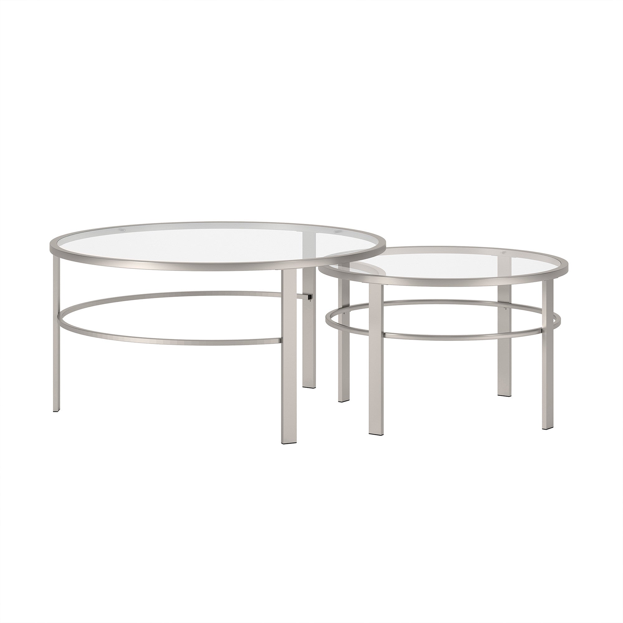 - Set of 2 coffee tables with a sleek silver nesting design.