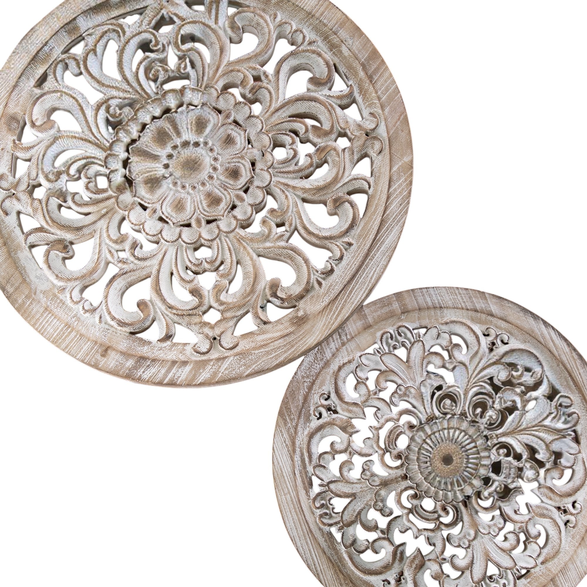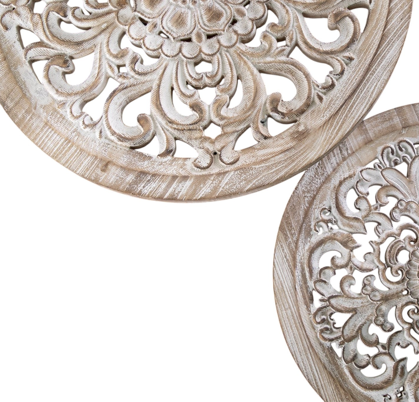 - Tabletops are solid wood that has been intricately carved into a beautiful floral design and is whitewashed for a rustic look.