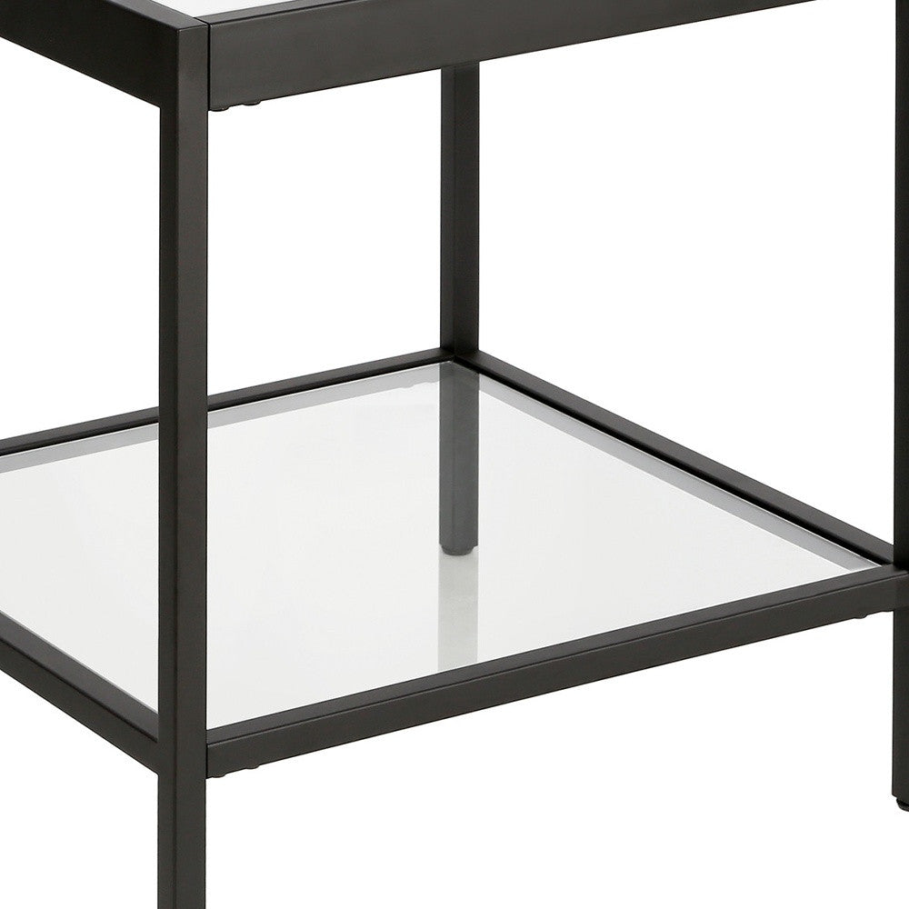 - Modern black design with metal and glass materials.