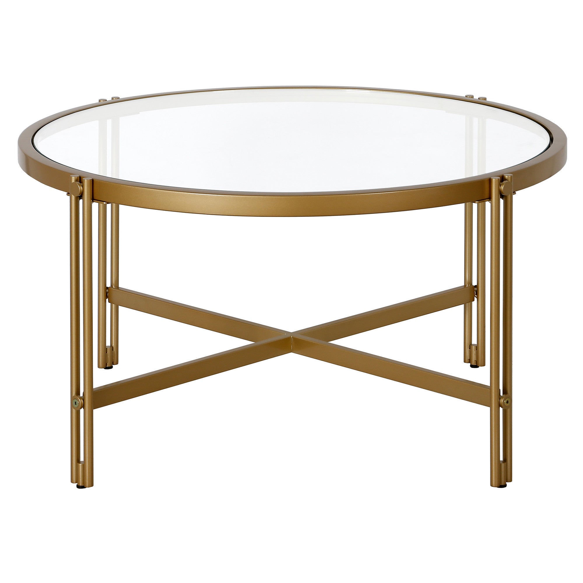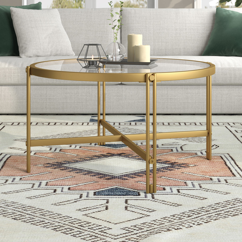 - Stylish and sleek gold coffee table with a glass top and steel base.