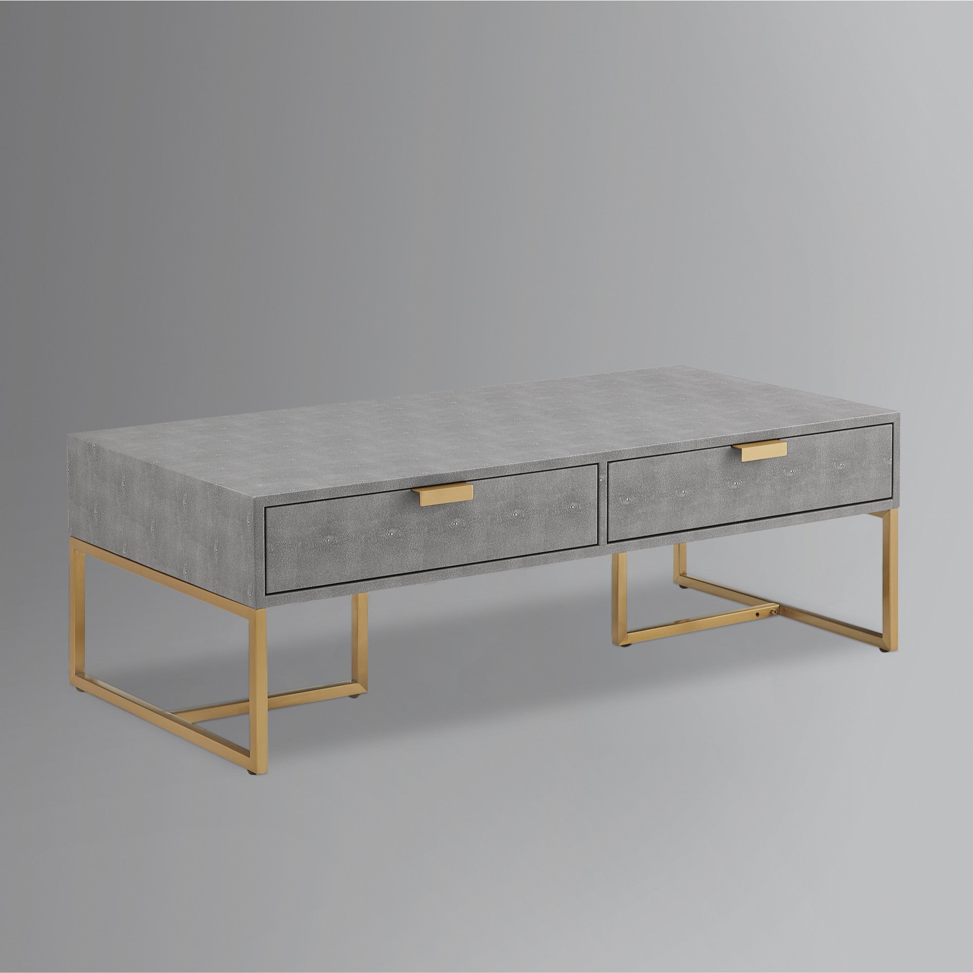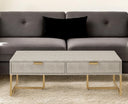 - Stylish and elegant gray coffee table with a gold base.