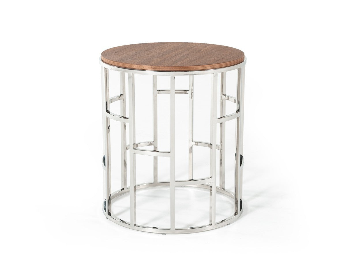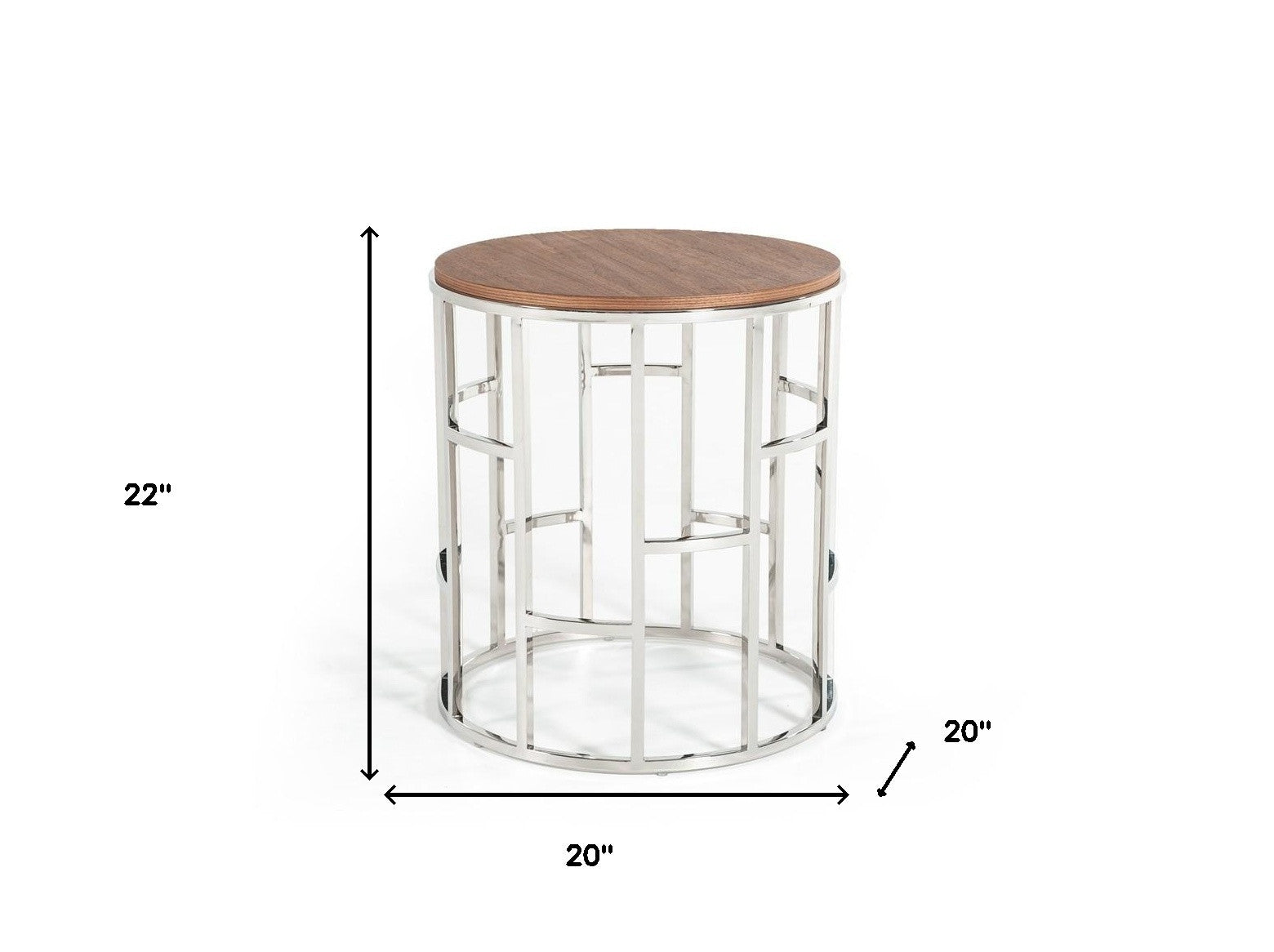 - Features mixed media with a walnut veneer Top and a shiny stainless steel metal base.
