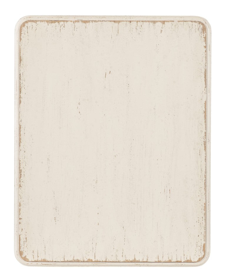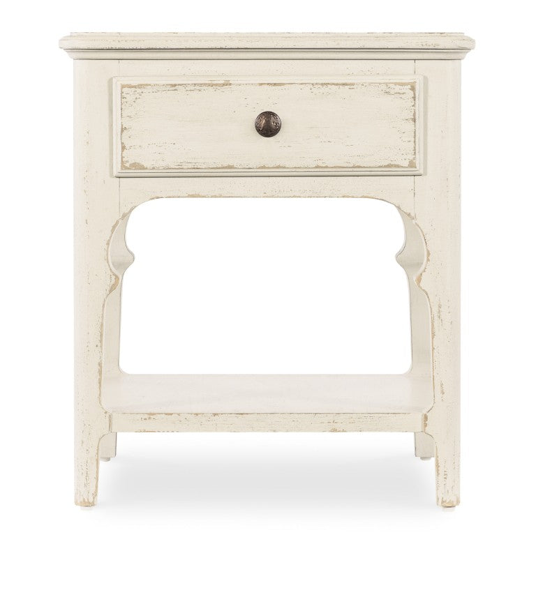 Evoking a timeless, heirloom-quality look, this Americana end table blends classic cottage charm with practical storage. Its time-worn white finish over cathedral oak veneers reveals warm oak character and handcrafted distressing, while scalloped legs and antique-bronze hardware add nostalgic detail. Ideal beside a sofa or bed, the table offers a self-closing drawer and a fixed shelf for everyday organization.