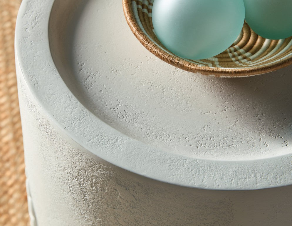 Bring refined texture and subtle botanical charm to small spaces with this round end table. Inspired by the matching cocktail table, its plaster-like finish and embossed leaf motif create a light, organic look that complements contemporary and casual interiors. Solidly constructed from wood and resin, the table offers a durable, easy-care surface and a compact footprint ideal for living rooms, bedrooms, or entryways.