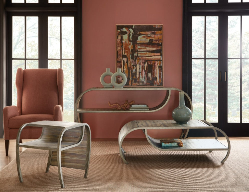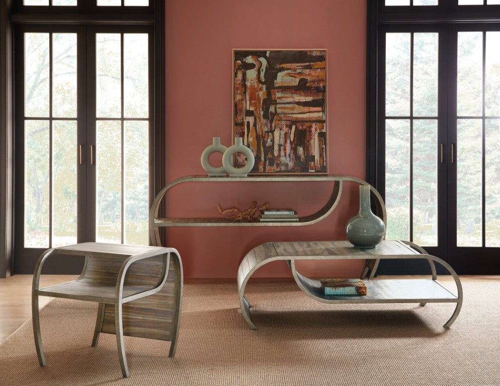 Bring rustic charm and modern silhouette to your living space with this Open Ended End Table. Its graceful curved profile and mixed-material construction — distressed planked wood paired with a pewter metal frame — create a versatile accent piece that works equally well in casual and transitional interiors. Thoughtful detailing, including visible knots and cutter-mark distressing, gives the table authentic character while a fixed lower shelf adds practical storage.