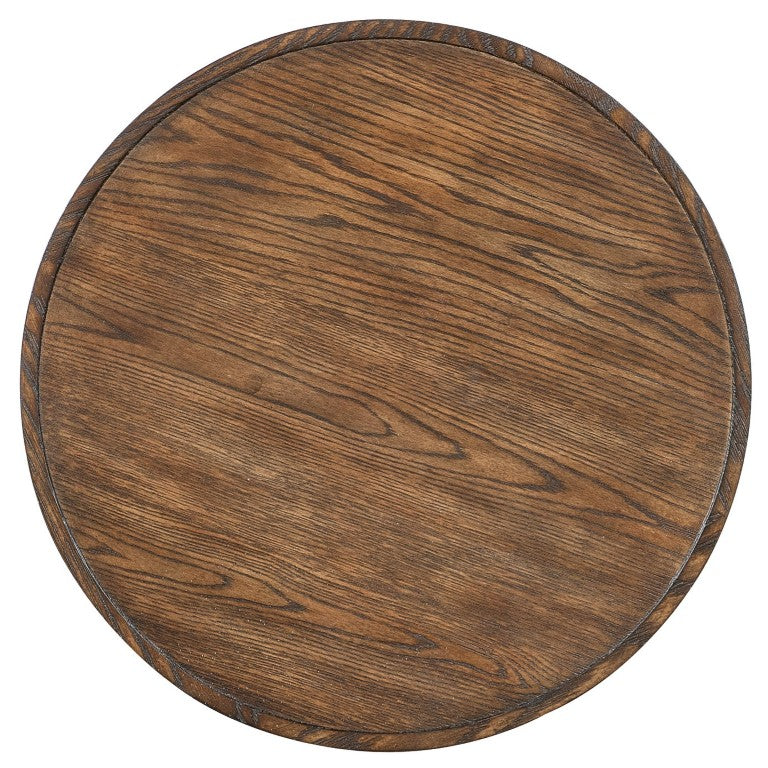 - Design: Round tabletop with a turned, bobbin-inspired pedestal base that adds vintage character