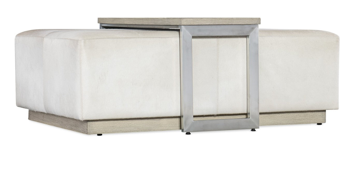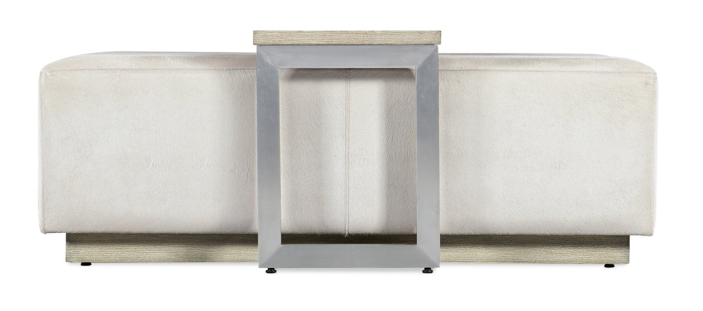 Elevate your living space with this refined bridged cocktail table that blends modern functionality and natural texture. Upholstered in cream hair-on-hide leather and anchored by a light wood plinth, the design offers a warm, transitional aesthetic while the movable tray top provides practical surface flexibility for drinks, snacks, or devices.