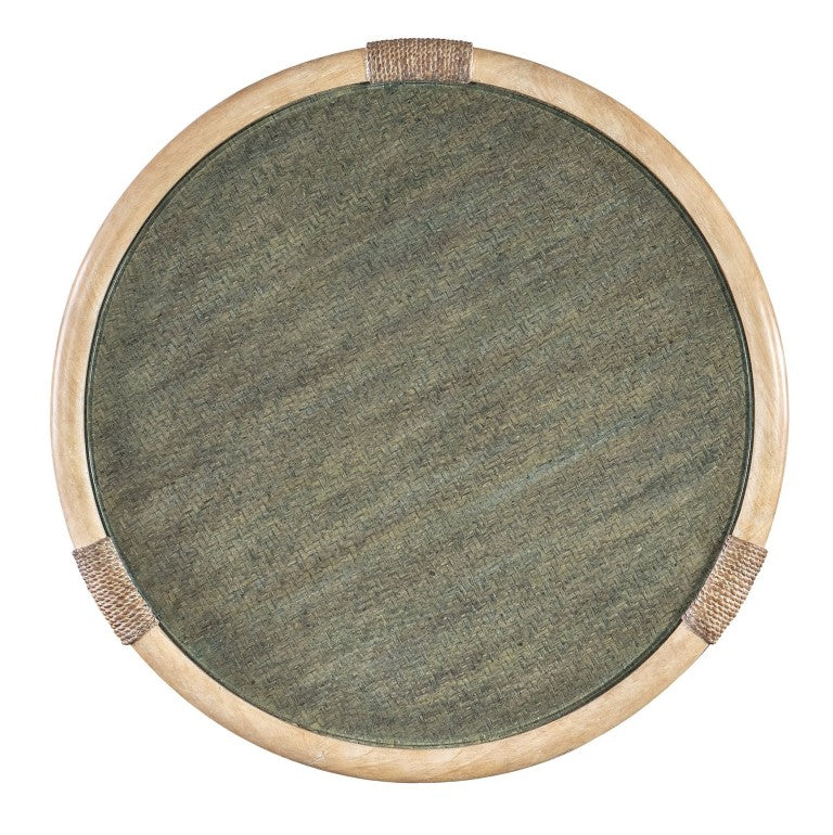 Bring warm, coastal charm to any living space with this relaxed, tropical-inspired end table. Combining natural textures and gentle colors, it serves as both a functional surface and a decorative accent — ideal beside sofas, chairs, or in a sunroom. The Retreat Raffia End Table blends maple veneer, painted raffia, rope detailing and a tempered glass inset for a layered, versatile look that complements casual and transitional decor.
