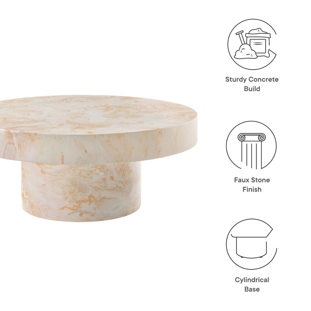 - 34 Inch Round Coffee Table Solid Concrete Build Faux Stone Finish Cylindrical Base Indoor/Outdoor Design Easy Assembly Required