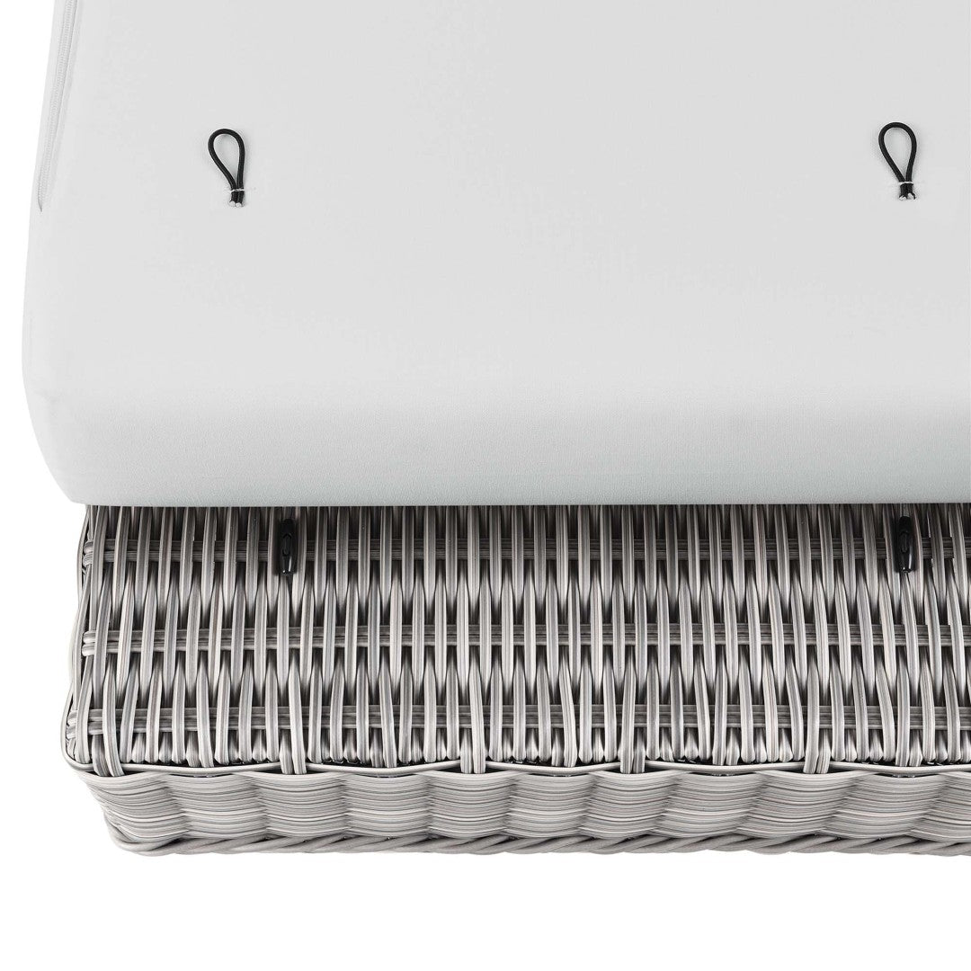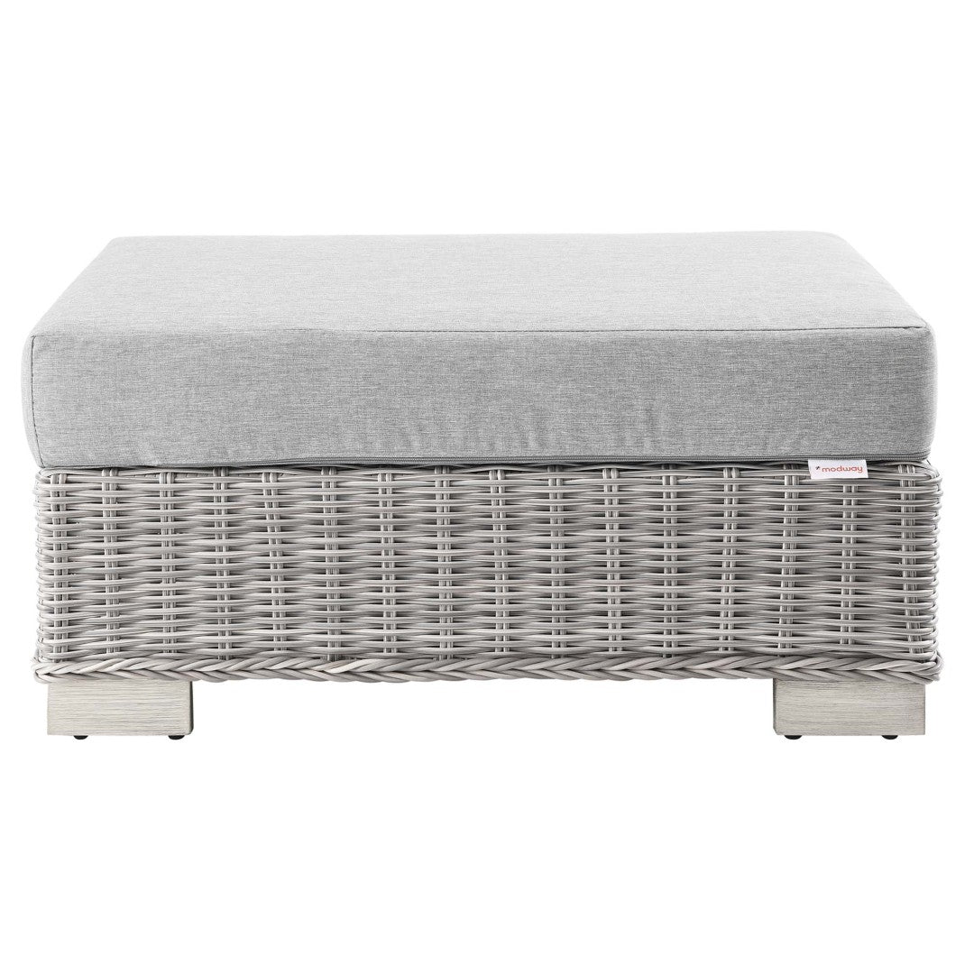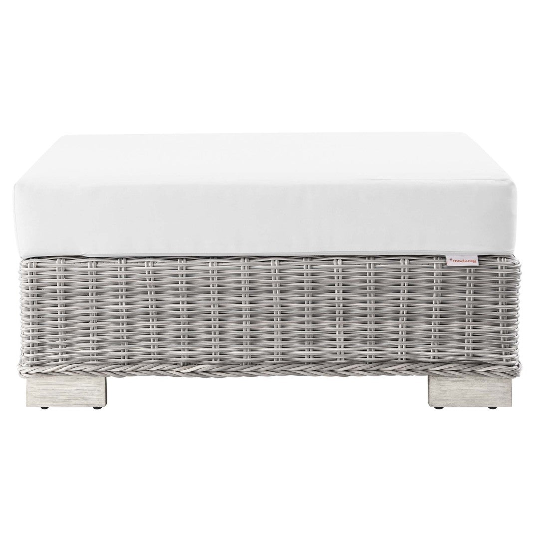 Bring effortless comfort and modern style to your outdoor living area with this Conway patio ottoman. Designed for durability and everyday relaxation, it pairs weather-resistant construction with a plush, removable cushion for seating or lounging by the pool, on the patio, porch, balcony, or backyard. Clean lines and a neutral light-gray wicker finish blend with a range of outdoor decor while powder-coated aluminum and thoughtful details ensure long-lasting performance.