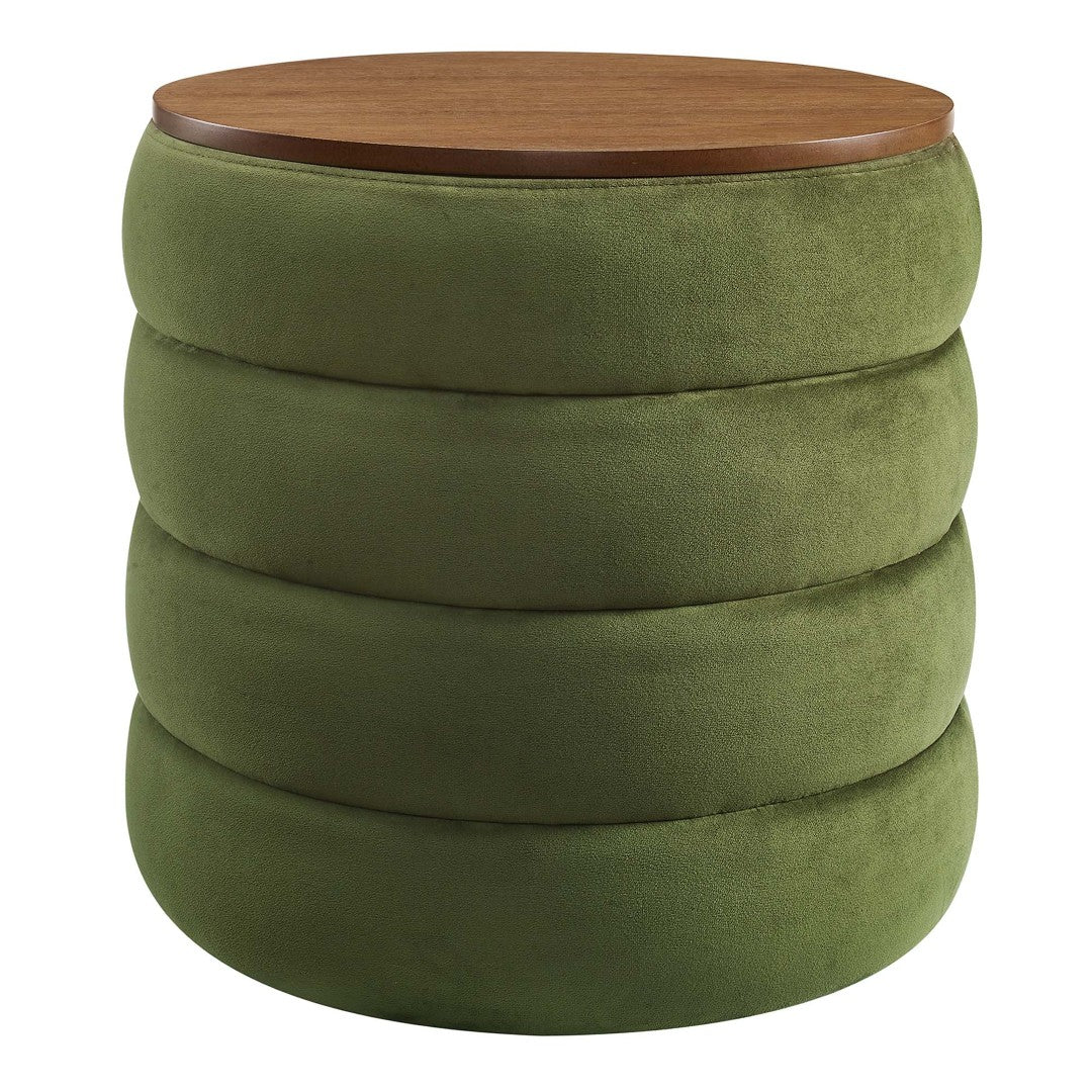 Add a touch of modern luxury and everyday practicality to any room with this round performance velvet storage ottoman. Densely padded and wrapped in stain-resistant velvet, it offers comfortable seating or a plush footrest while concealing a generous storage compartment beneath a wood-grain veneer lid. Channel tufting and non-marking foot glides create a refined, functional accent that works as an ottoman, side table, or vanity stool—arriving fully assembled for immediate use.