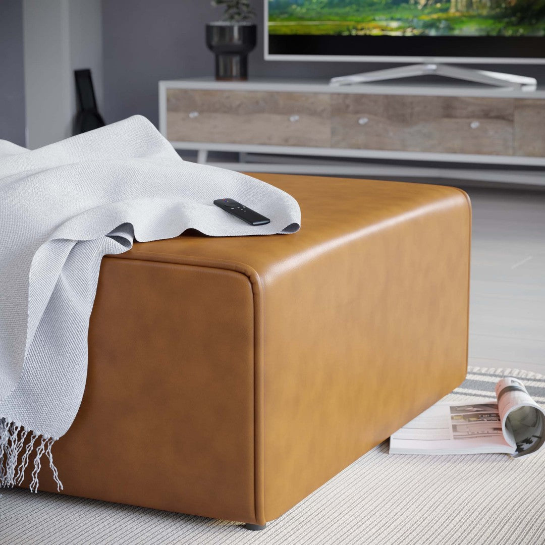 - Contemporary Modern Ottoman Vegan Leather Upholstery Generous Foam Padded Cushions Elegant Trim Piping Sturdy Plastic Legs Ottoman Weight Capacity: 440 lbs.