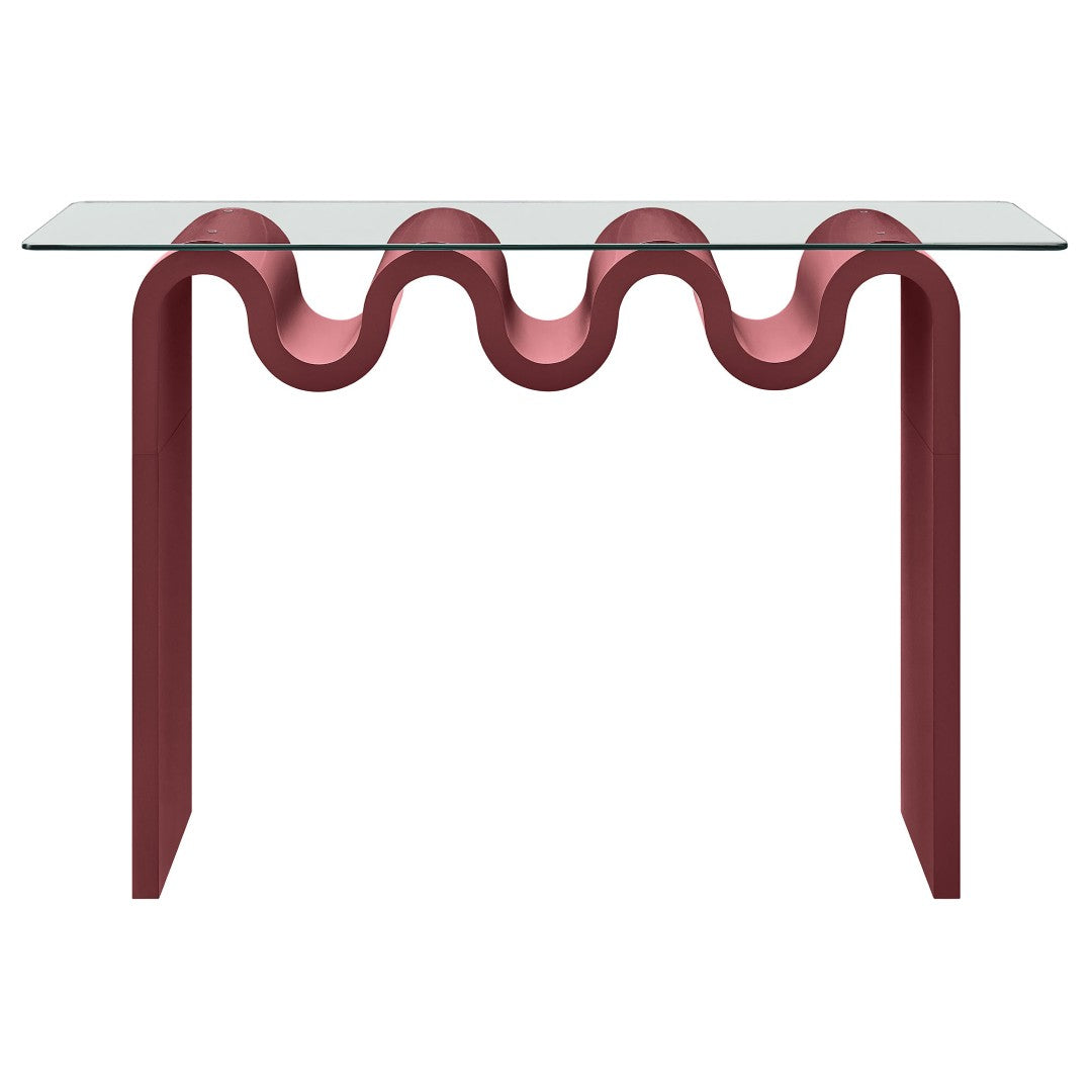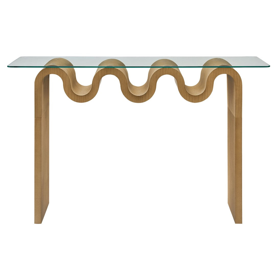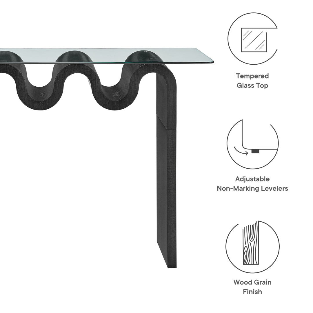 Add a sculptural, retro-modern accent to your entryway, living room, or home office with this Ondine glass-top console table. Its bold wave-shaped base and clear tempered glass surface create a light, airy silhouette that highlights the table’s artistic form while providing a sturdy, functional surface for decor, keys, or media components.