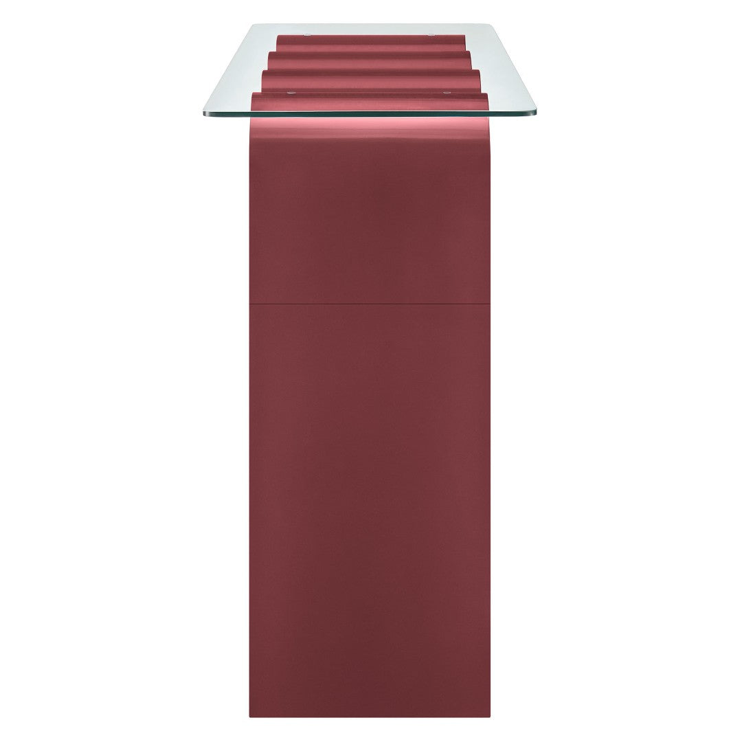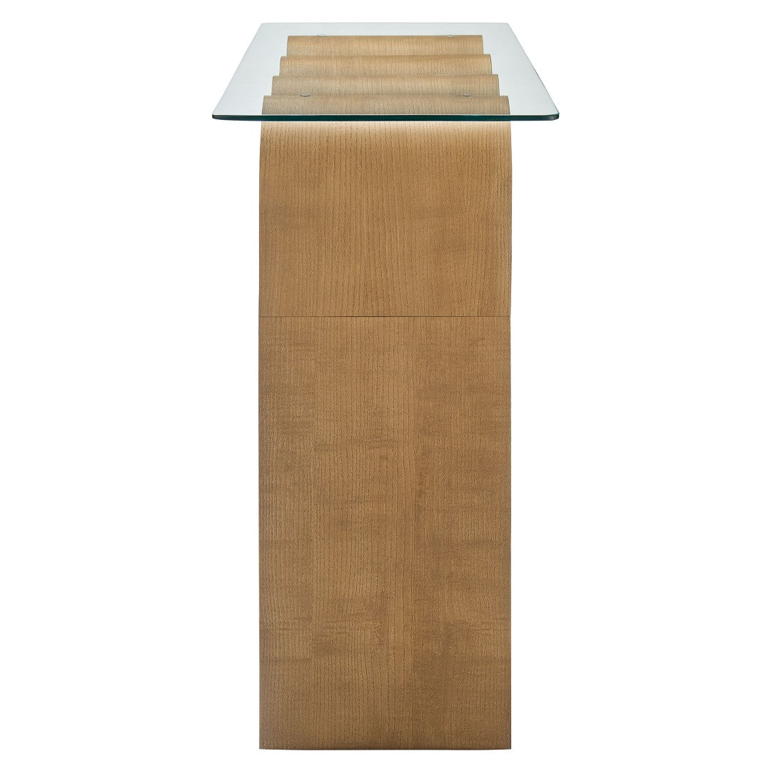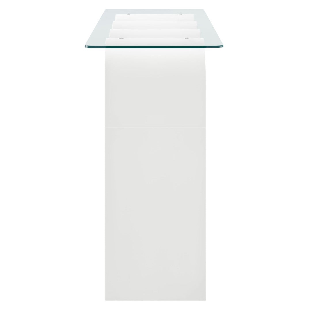 Add a sculptural, retro-modern accent to your entryway, living room, or home office with this Ondine glass-top console table. Its bold wave-shaped base and clear tempered glass surface create a light, airy silhouette that highlights the table’s artistic form while providing a sturdy, functional surface for decor, keys, or media components.