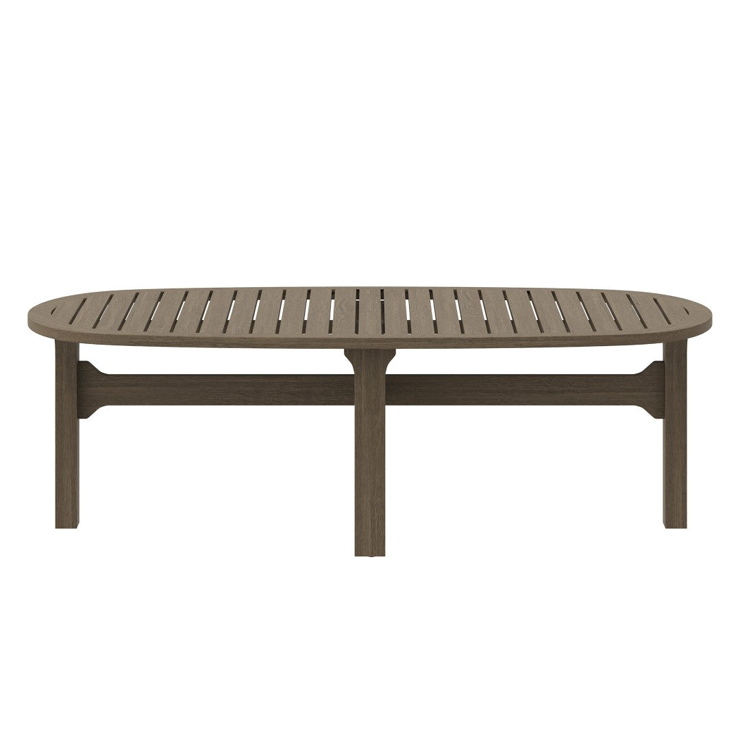 - Teak Wood Coffee Table Oval Slatted Tabletop Weather-Resistant Water-Based Finish Intersecting Stretchers Non-Marking Floor Glides Assembly Required