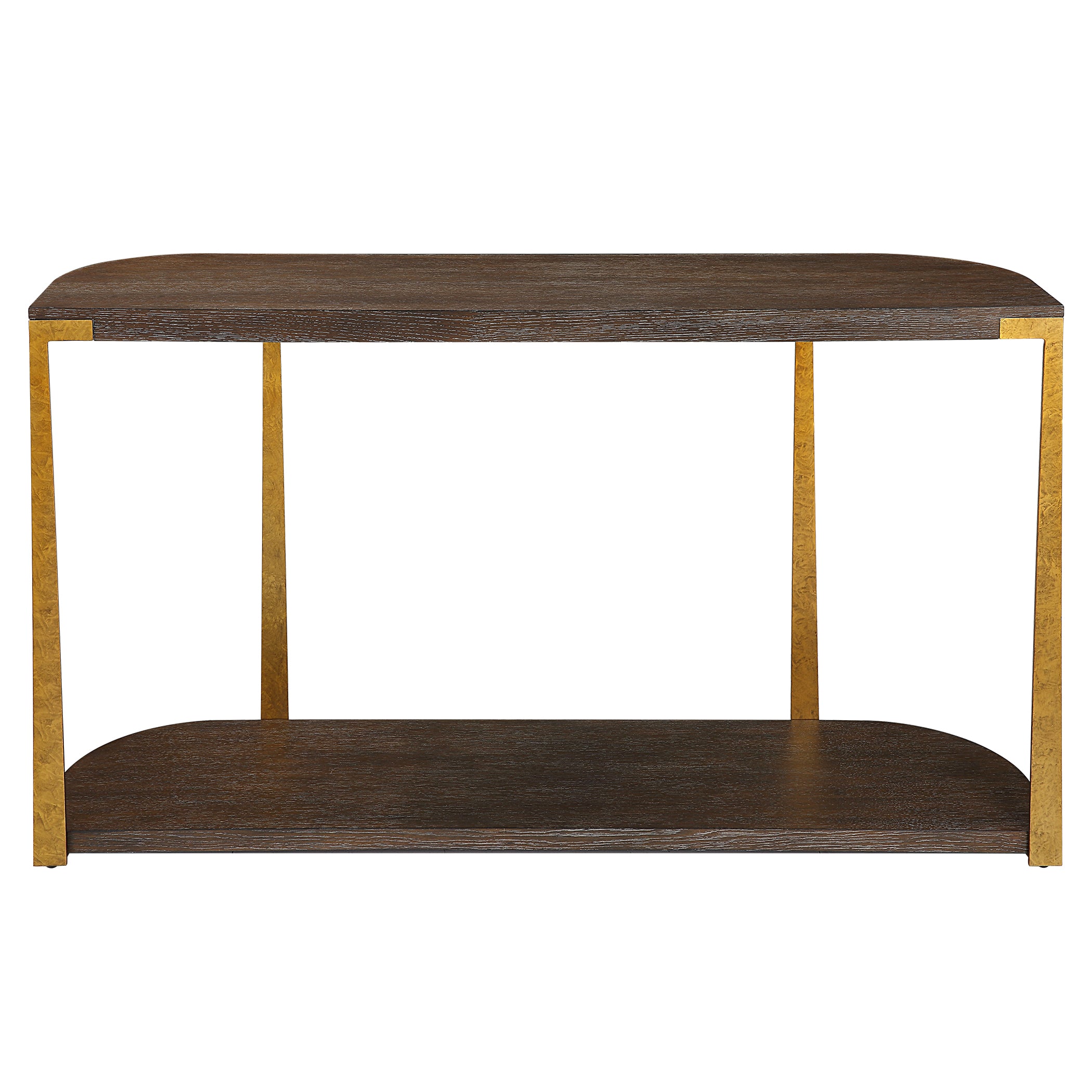 - Finish/Frame Description: The Palisade Console Table Is Finished In A Rich Coffee Finished Oak Veneer With Natural Wood Grain Details Accented By Forged Metal Columns Finished In Mottled Antique Gold.