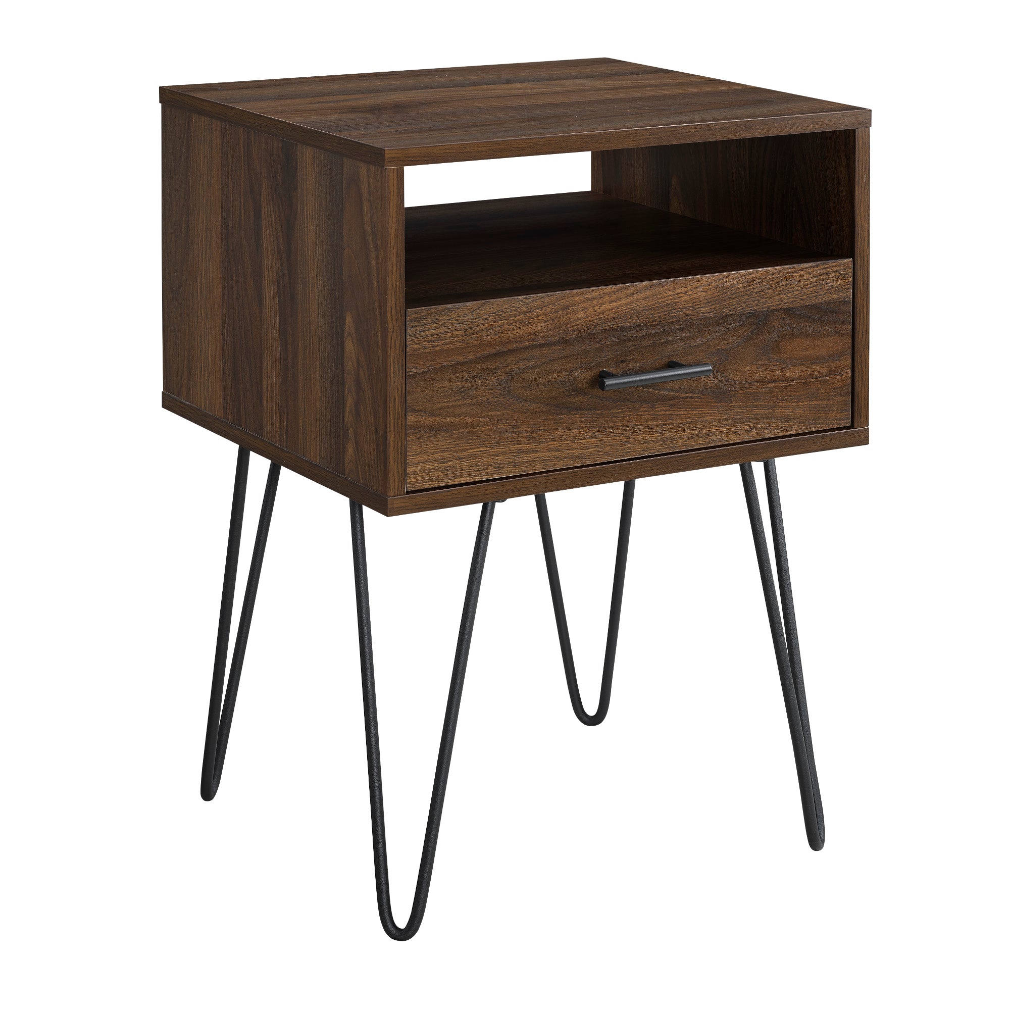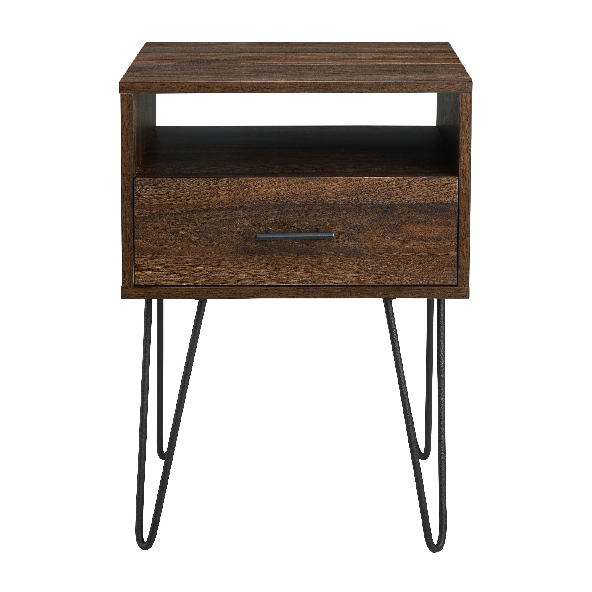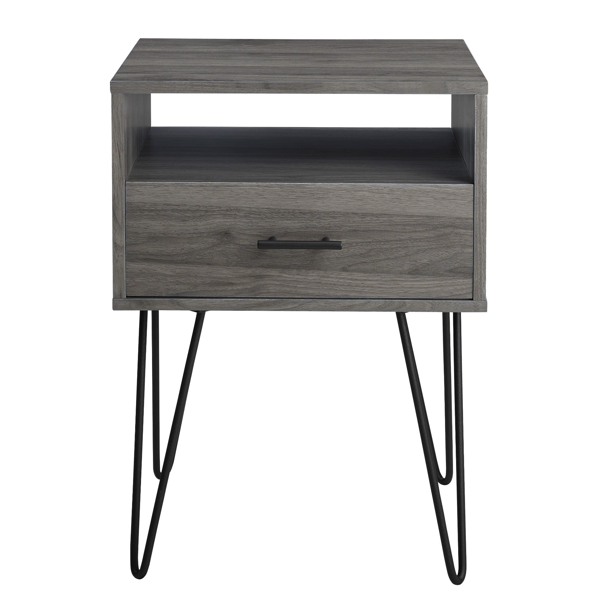 Keep your side table contemporary with this single drawer hairpin leg accent table. It features a convenient combination of open and closed storage. The single drawer has metal glides for easy opening. On top of multiple storage options, this modern end table also has a rich sense of character with its sleek metal hairpin legs. Stage it in a living room, home office, or dining room.