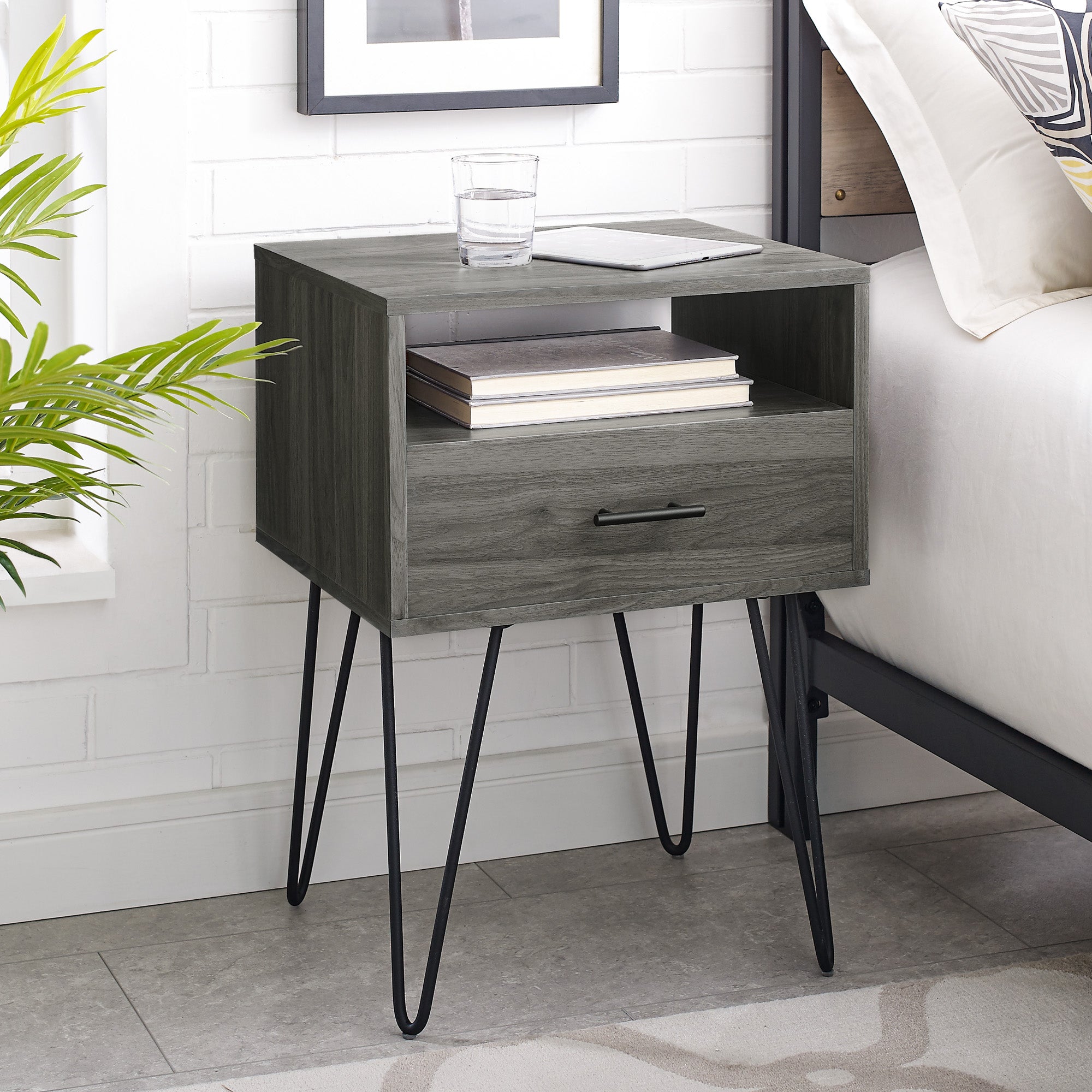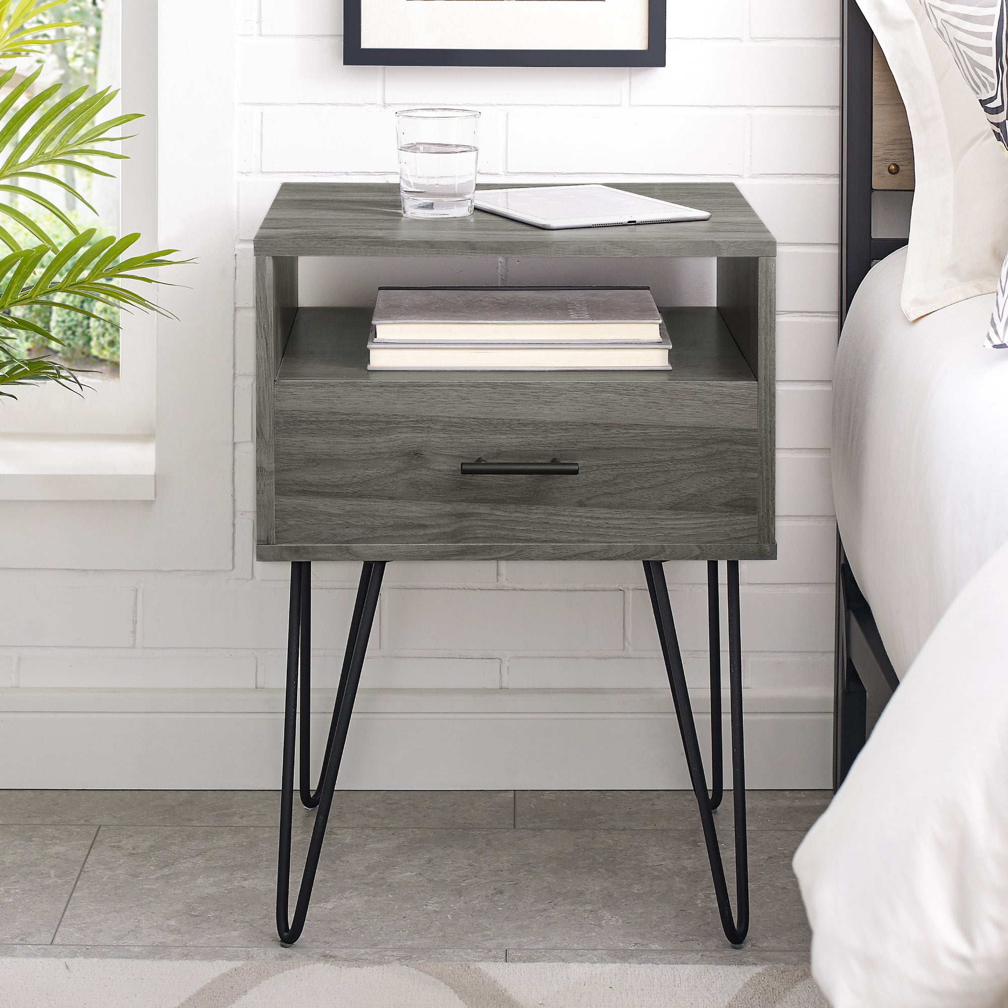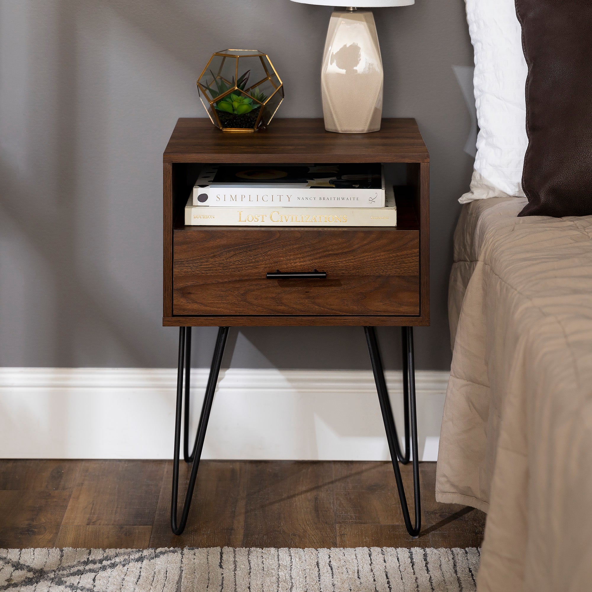 Keep your side table contemporary with this single drawer hairpin leg accent table. It features a convenient combination of open and closed storage. The single drawer has metal glides for easy opening. On top of multiple storage options, this modern end table also has a rich sense of character with its sleek metal hairpin legs. Stage it in a living room, home office, or dining room.