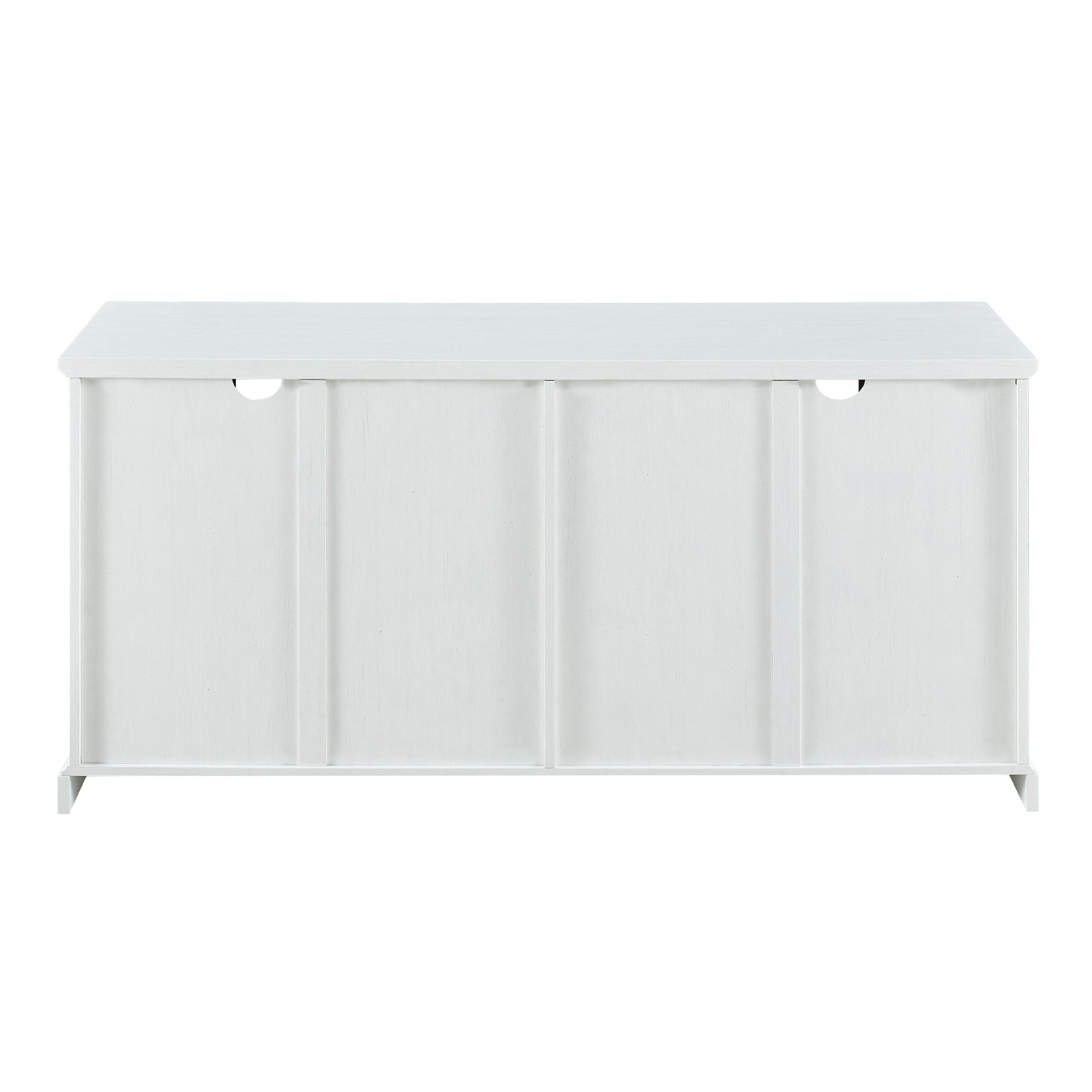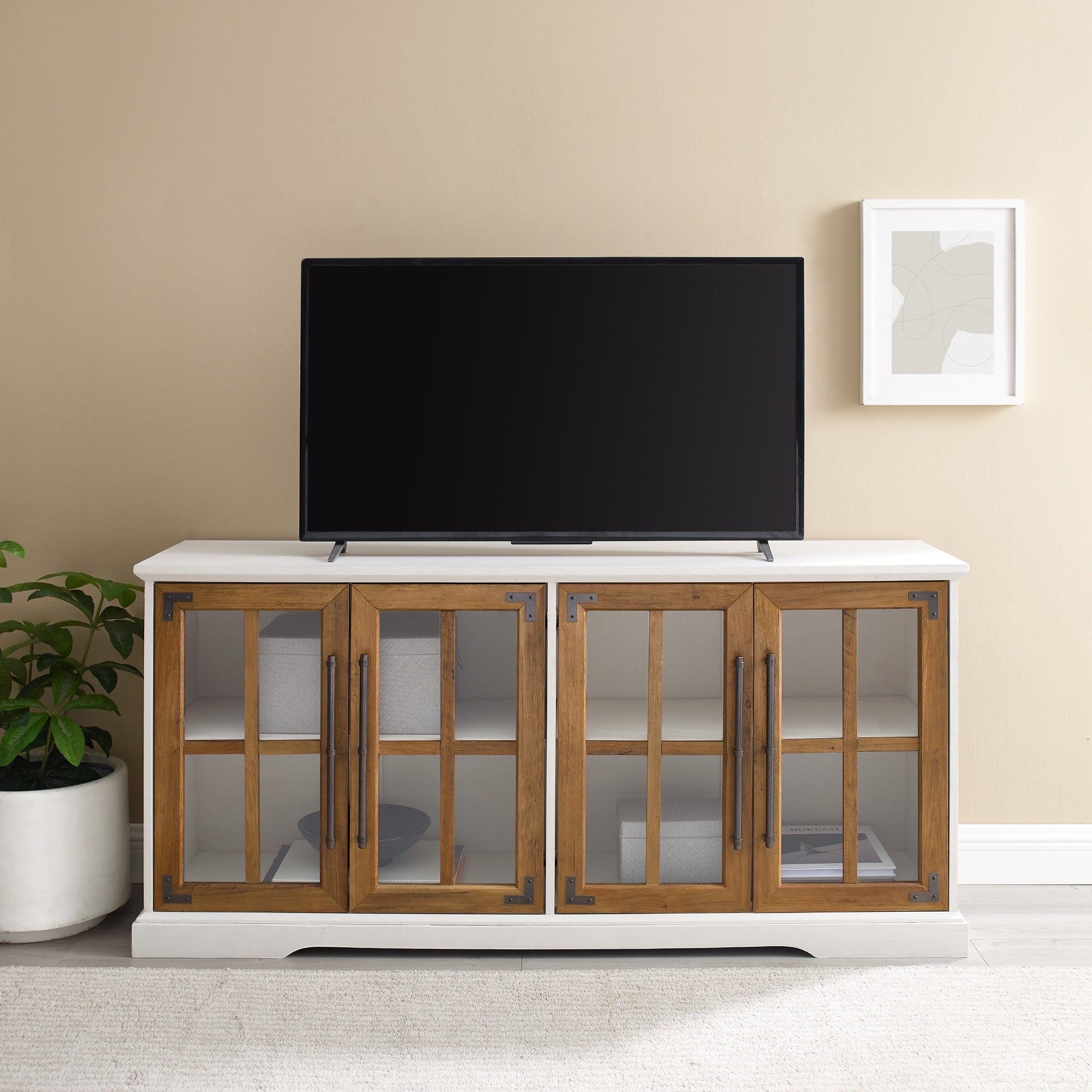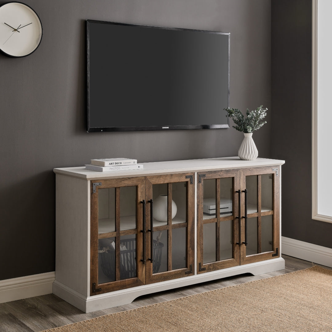 - Additional Features: 4 wood and glass doors with adjustable soft close metal hinges, cord management, beveled top panel, long handles and metal accents gives this piece its style - Estimated Assembly Time: 150 minutes