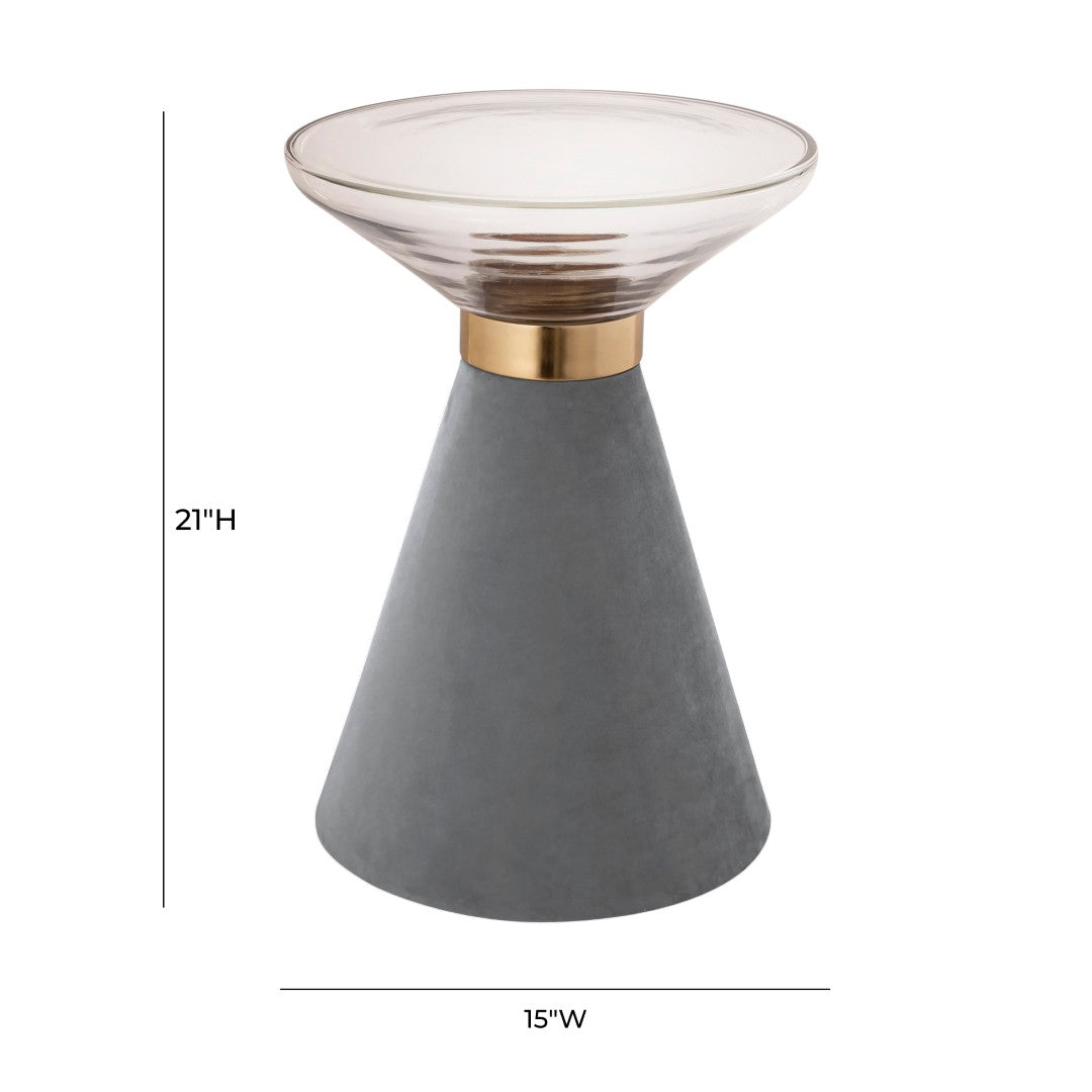 Elevate your living area with the Aurora side table ” a refined blend of contemporary minimalism and luxe detailing. Its transparent cloud-hued glass top floats above a grey velvet“upholstered conical base, accented with warm gold hardware for a sophisticated, sculptural statement that complements modern and transitional interiors alike.