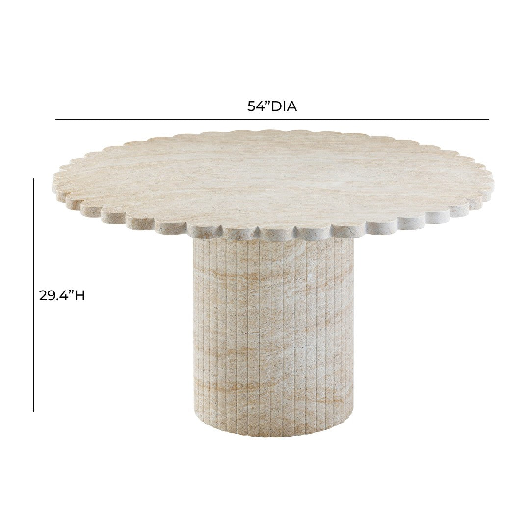 Elevate your dining experience with a piece that blends sculptural design and durable outdoor performance. This 54" round dining table features a refined flower-petal silhouette, vertical channeling on its base, and a light washed travertine finish with authentic surface texture”ideal for stylish indoor dining or relaxed alfresco entertaining. Generously sized to host family meals or social gatherings, the table is handmade from robust materials to withstand everyday use while maintaining a contemporary, high-end look.