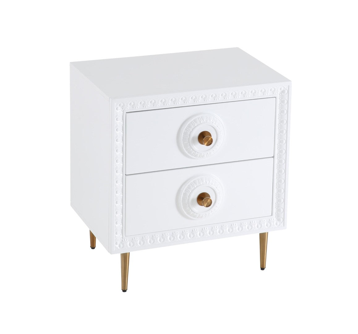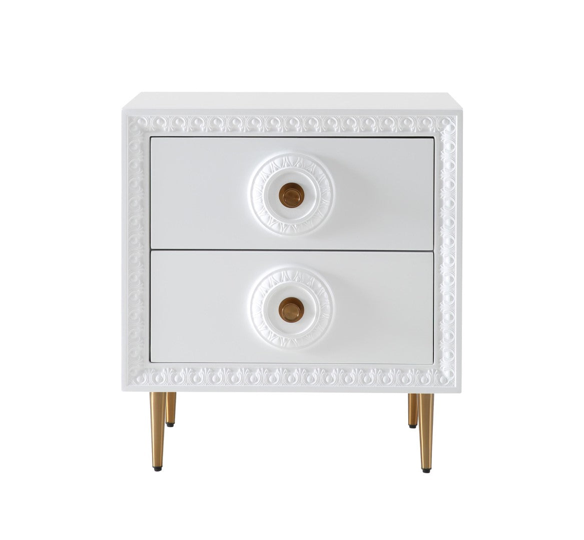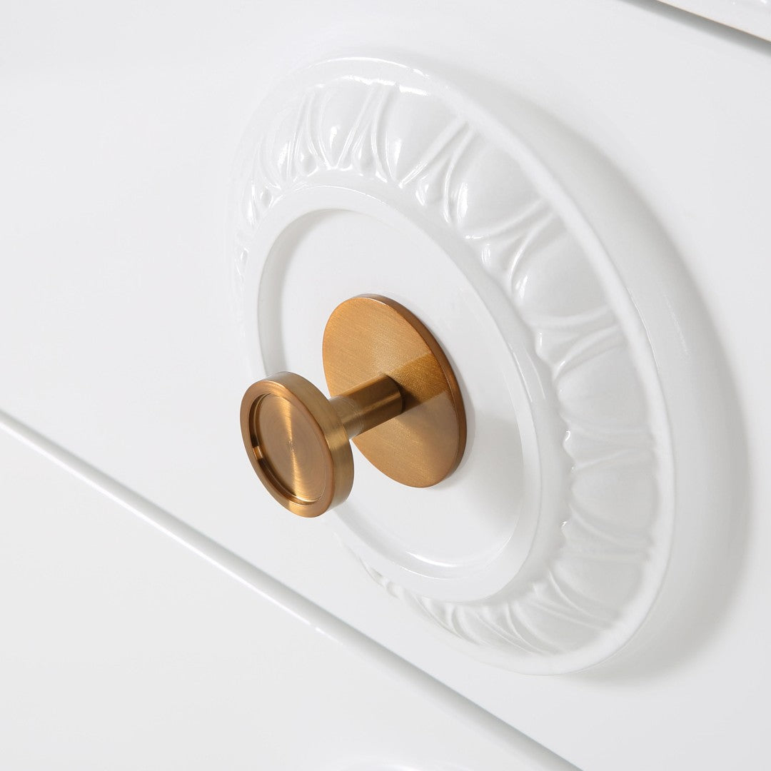 - Finish & Style: High-gloss white lacquer with intricate molding and polished gold hardware for a luxe, designer look.