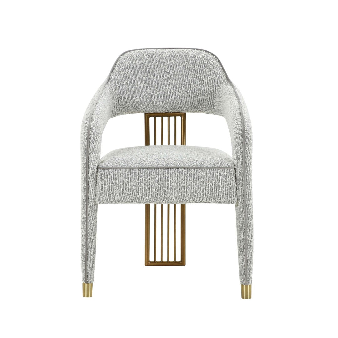 - Finish & Color: Grey boucle upholstery with gold-tone metal accents