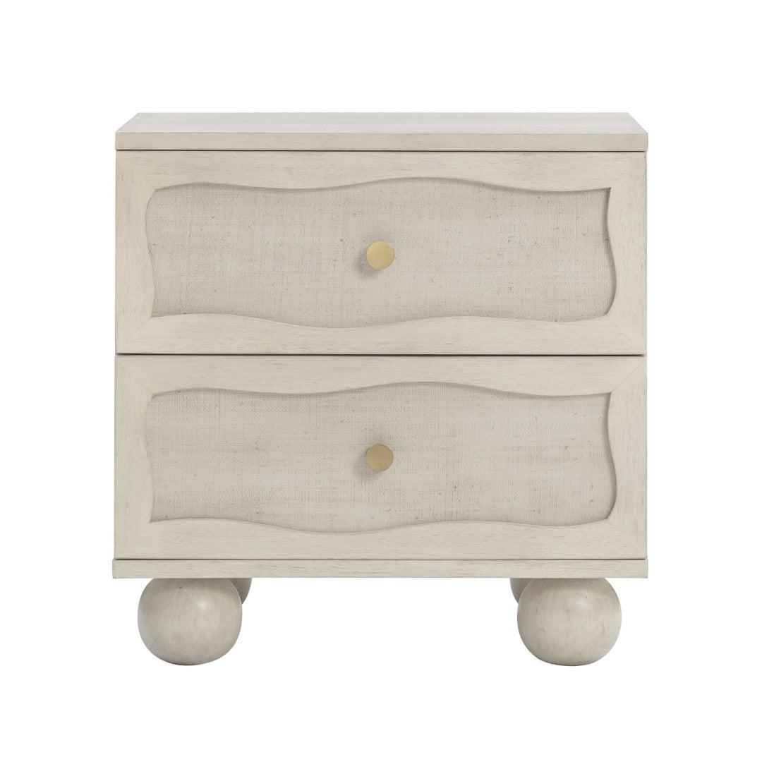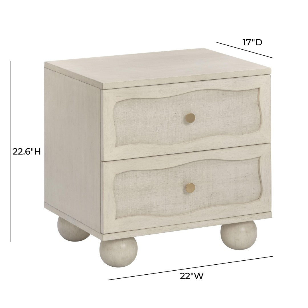 Bring coastal calm and modern boho style to your bedroom with this elegant 2-drawer nightstand. Natural woven raffia fronts, a whitewashed wood finish, and gently rolled contours create a relaxed, airy look while durable rubberwood construction and soft-close hardware ensure everyday functionality. Ideal for bedside storage or as an accent piece in a serene, beach-inspired interior.