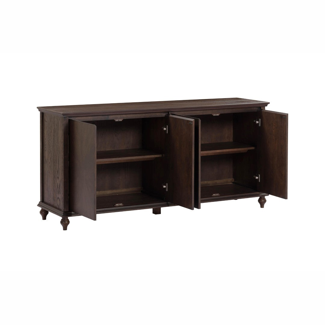 Elevate your dining or living area with the Mila Dark Brown Wood Sideboard ” a refined storage solution that blends sculptural design with everyday practicality. Its striking starburst veneer doors and rich dark brown finish create a focal point while the thoughtful interior layout keeps dinnerware, linens, and media accessories neatly organized and accessible.