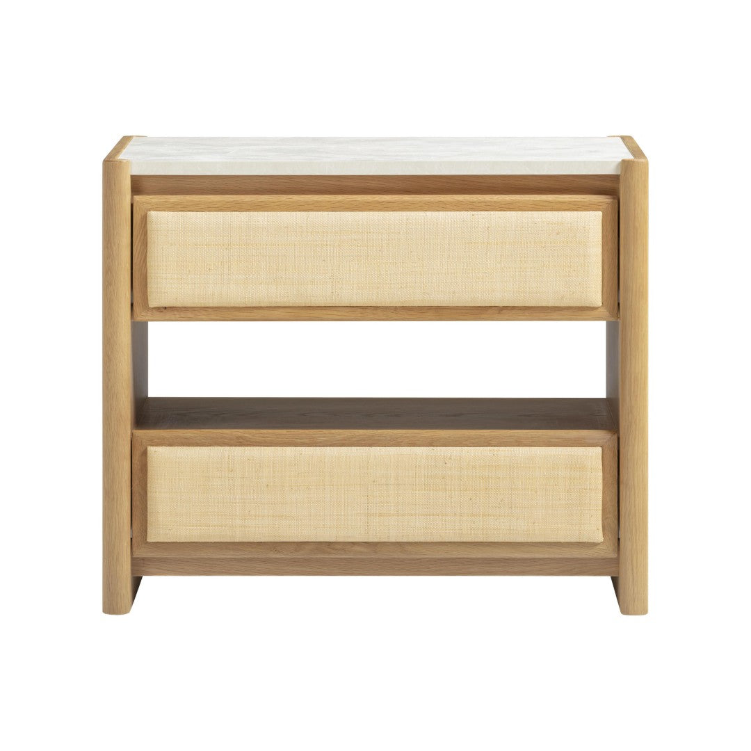 Bright and breezy, this nightstand blends mid-century silhouette with tropical texture for a relaxed, refined bedroom look. Crafted from solid white oak with raffia-front drawers and a creamy faux-marble top, it delivers durable everyday function with tactile, sunlit style”no sealing or staining required. Soft-close, felt-lined drawers and a fully assembled delivery make it an easy, elegant addition to modern or coastal-inspired interiors.
