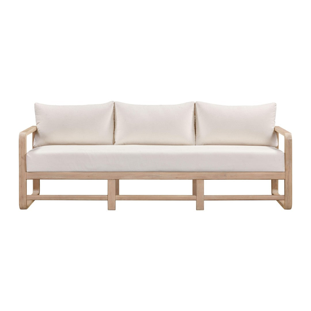 Relax in outdoor comfort and refined style with the Palata Sofa. Designed for generous lounging and built to withstand everyday outdoor living, this sofa pairs a light teak“finished eucalyptus frame with a distinctive flat-rope woven back and plush cream performance cushions. Its clean lines and durable materials make it equally suited for poolside gatherings, covered patios, or elegant outdoor lounges.