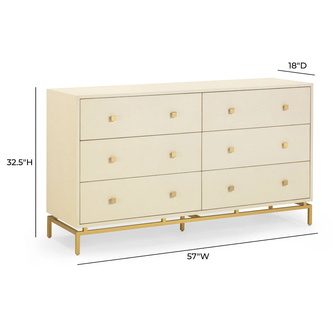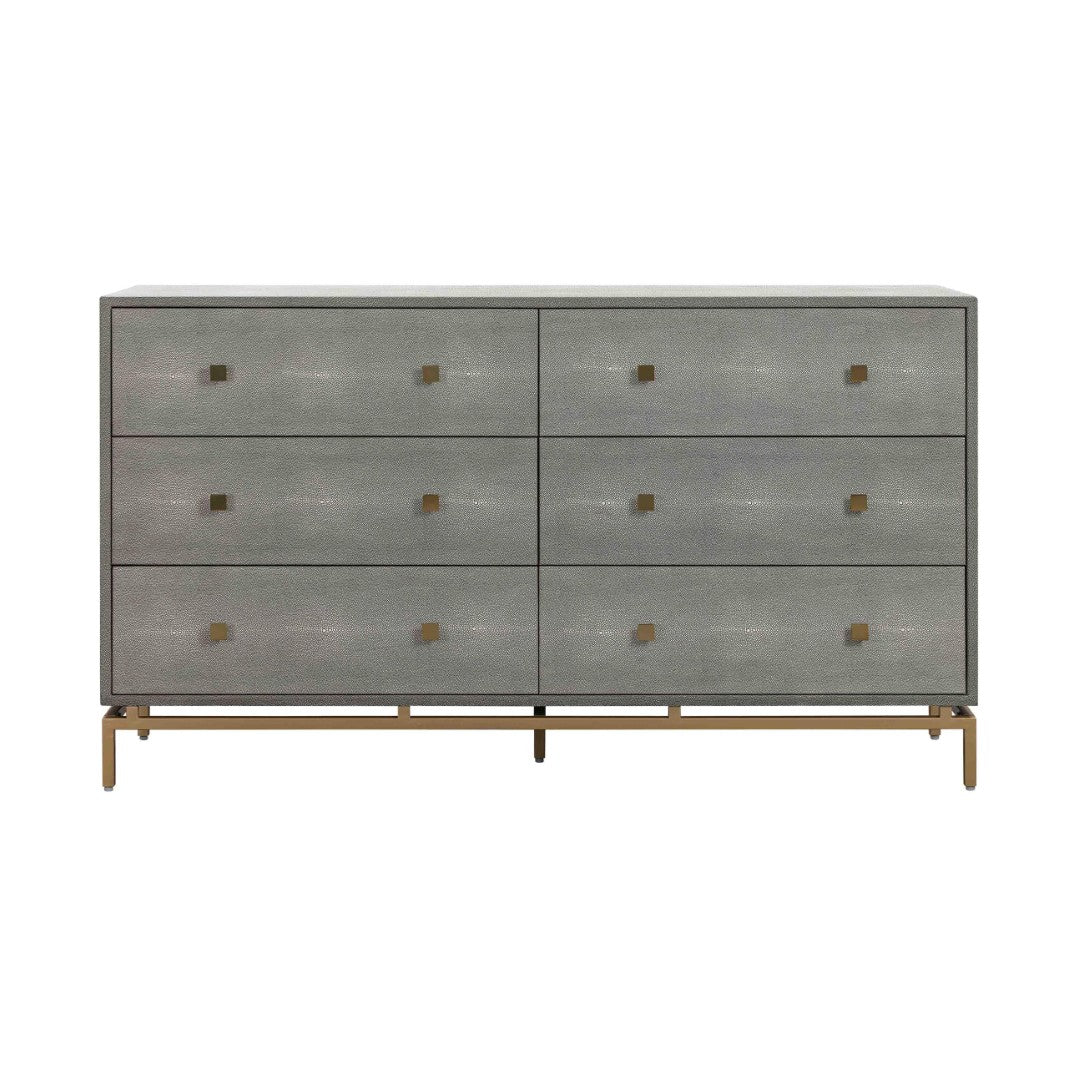 Introduce a refined centerpiece to your bedroom or living area with the Pesce Shagreen 6-drawer dresser, where artisanal craftsmanship meets contemporary design. The textured shagreen finish and warm brass hardware create a sophisticated contrast, while thoughtful details”like felt-lined drawers and sturdy brass legs”ensure this piece is both beautiful and functional. Handmade from acacia with a vegan shagreen surface, the dresser provides generous storage in a streamlined silhouette that complements modern and transitional interiors.