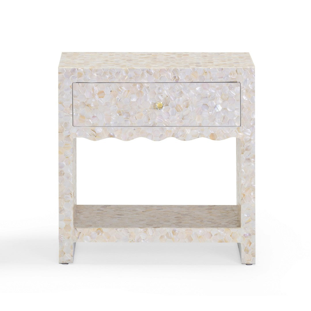 Elevate your bedroom with the Piara nightstand ” an artisanal accent that pairs luminous mother-of-pearl detailing with functional storage. The hand-laid shell surface creates a soft, opalescent shimmer that catches light beautifully, while scalloped edges and sculptural lines give the piece a refined, contemporary presence. Perfect beside a bed or sofa, it brings both visual warmth and everyday practicality to your space.
