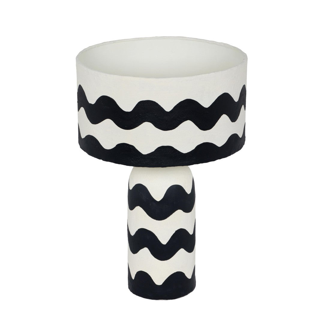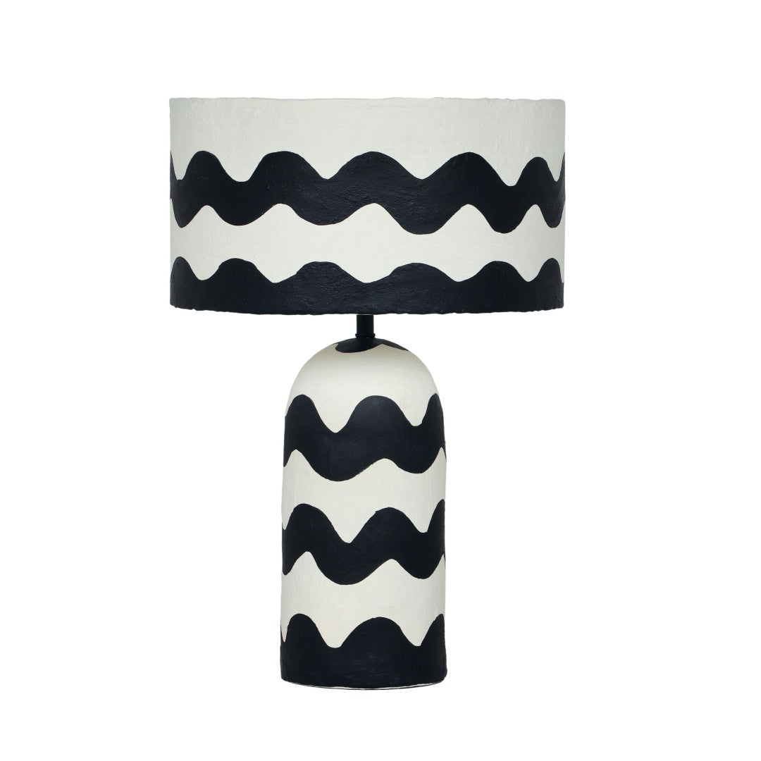 Bring an artistic, hand-crafted presence to your home with this striking black-and-off-white papier mache table lamp. Its sculptural silhouette and textured, painterly waves create a warm focal point that complements modern, eclectic, and coastal interiors alike. Ideal for side tables, consoles, or bedside nightstands, it delivers soft, ambient light while doubling as a conversation-starting decorative object.