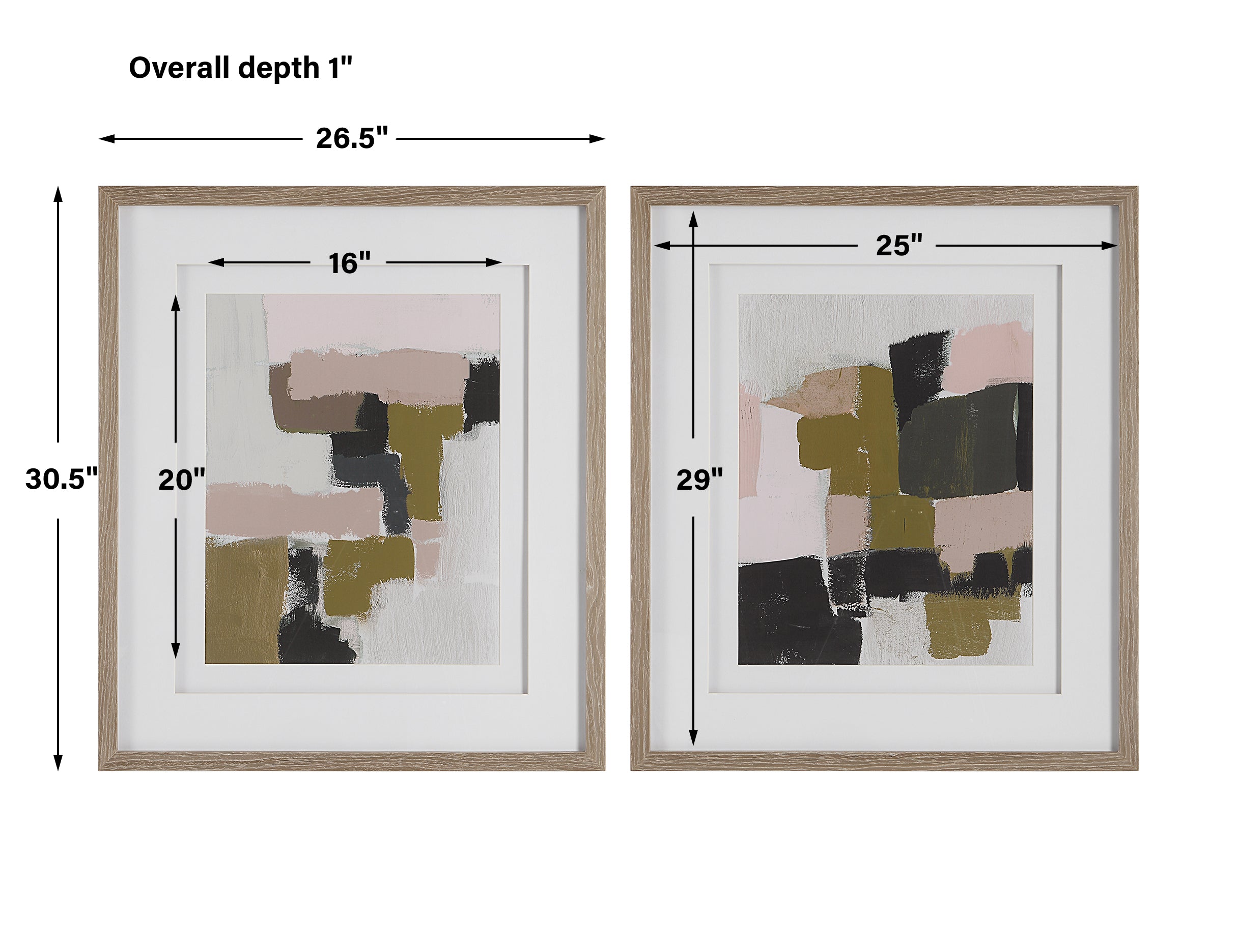 - Finish/Frame Description: Solid Wood Frame In Natural Oak Finish, Under Glass, Double White Matting With A Spacer, Abstract Color Block Print, Blush, White, Light Gray, Olive, Charcoal, Black, Mauve/gray