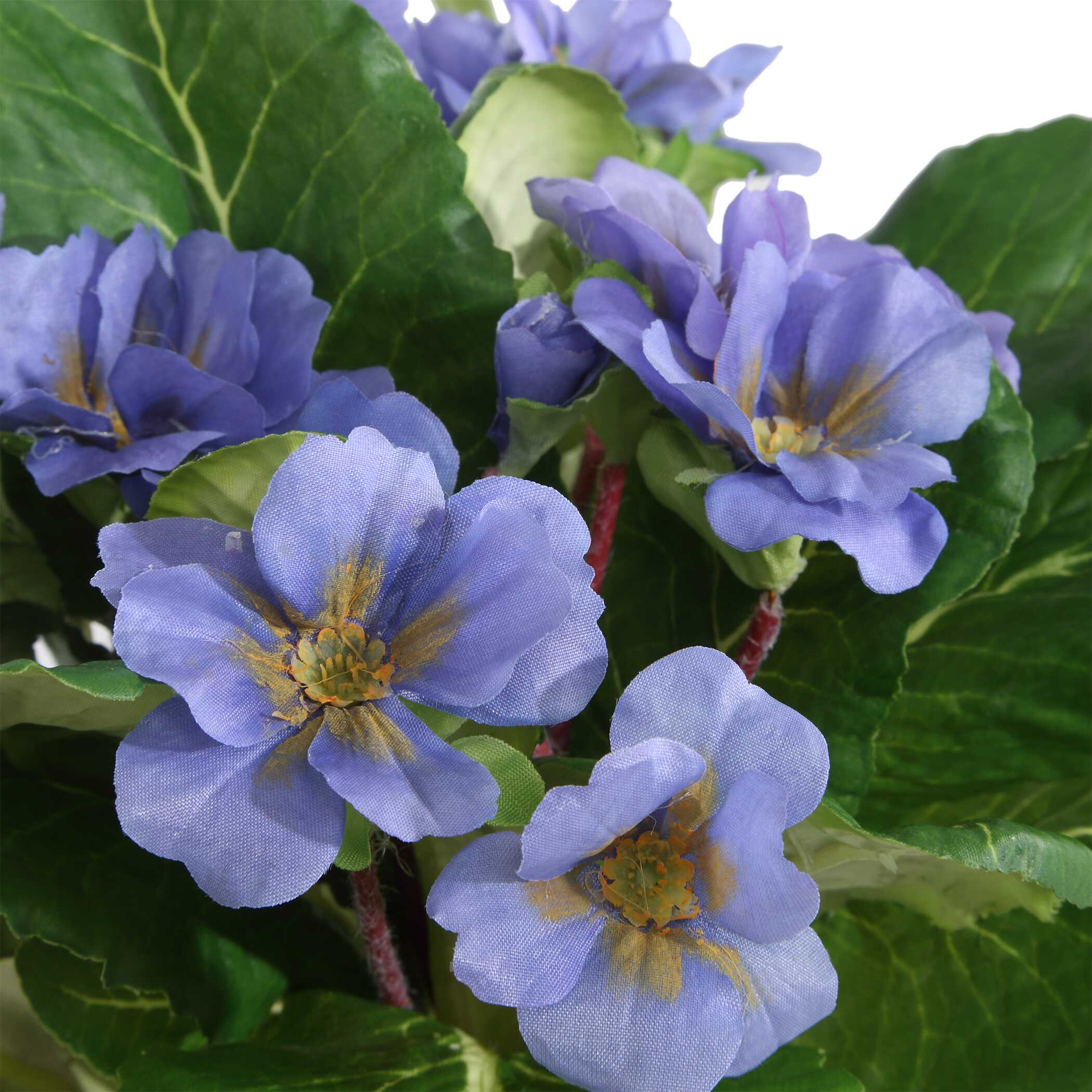 - A Trio Of Charming Primulas Featuring Broadleaf Foliage With Delicate Blooms In Periwinkle, White And Fuchsia, Potted In Dimpled, White Glazed Ceramic Containers.