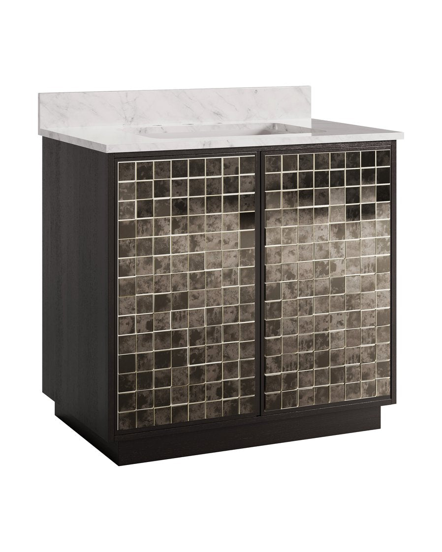 - Variations in the antiquing of the mirror tiles are inherent to the hand-placed design, while the Carrara marble top will feature natural variations in color and veining, ensuring each piece is one of a kind.
