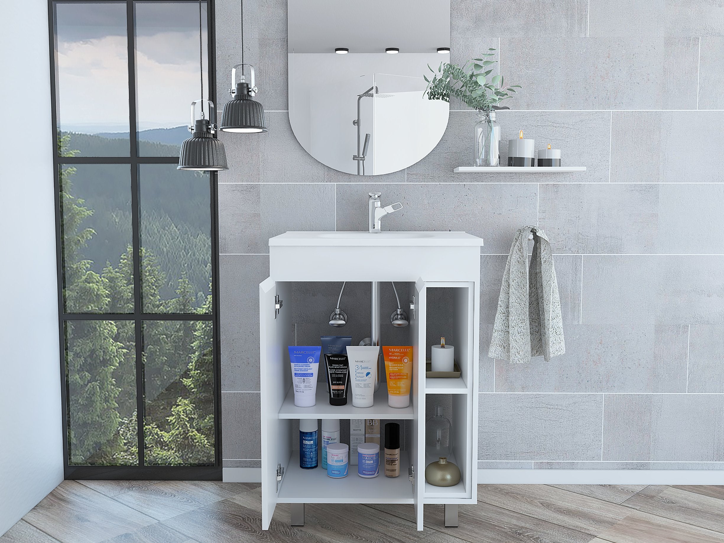 Elevate your bathroom with this compact, stylish vanity that blends modern design and practical storage. Finished in clean white with raised legs and open shelving, it provides a polished focal point while maximizing organization for small- to medium-sized bathrooms.