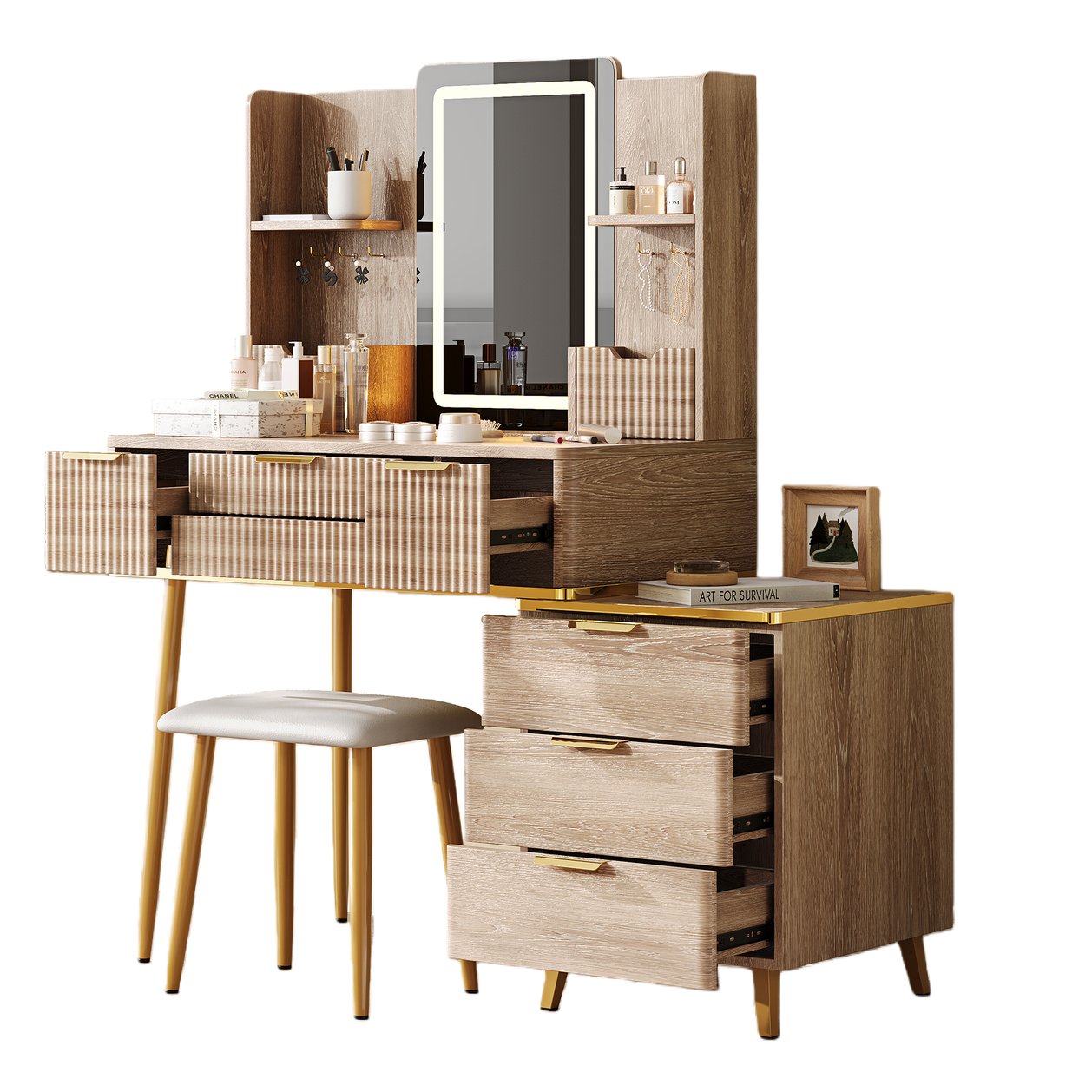 Give your dressing area a salon-ready upgrade with this elegant 7-drawer vanity. Thoughtfully designed for organization and comfort, it combines professional LED lighting, dedicated jewelry storage, and a plush PU stool with sturdy metal legs—making daily routines smoother and special-occasion prep effortless. Its fluted carved details and metal accents add a refined, contemporary touch that complements modern bedrooms and dressing spaces.