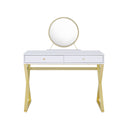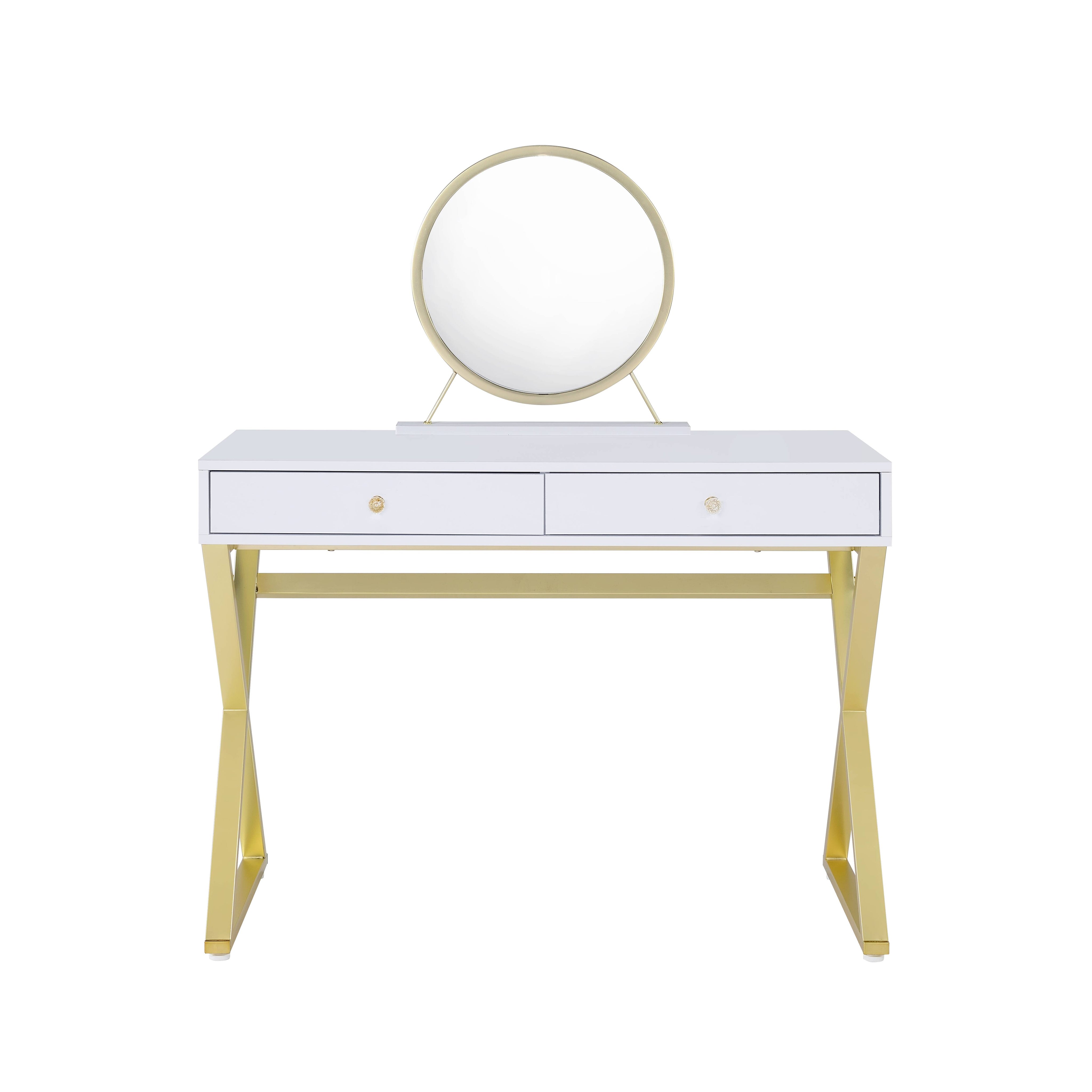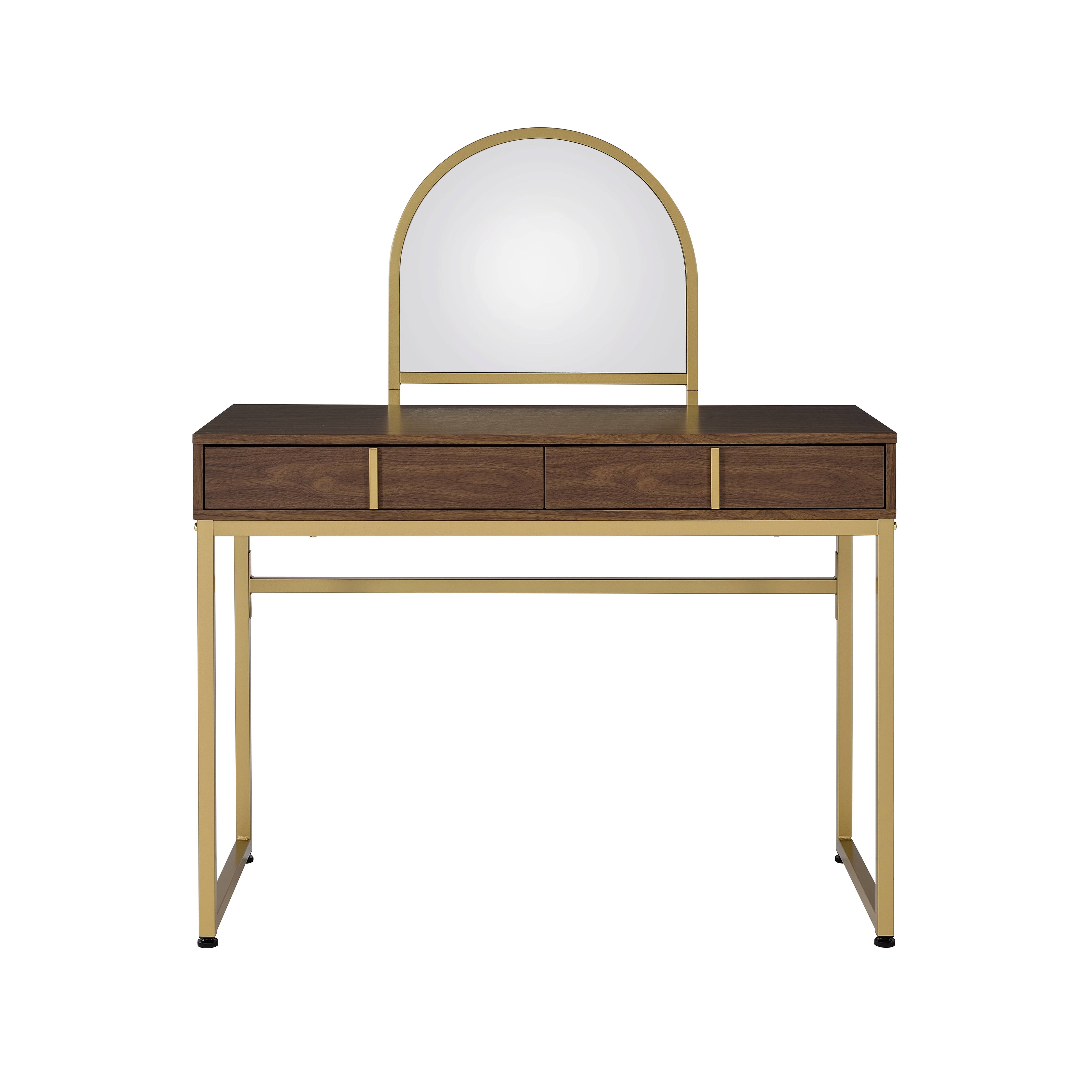 Add a touch of modern glam to your dressing area with this Coleen walnut and gold finish vanity. Designed for both style and function, it pairs warm walnut-toned surfaces with a sleek gold metal frame and comes complete with a mirror and removable jewelry tray—making morning routines and evening prep effortless and organized.