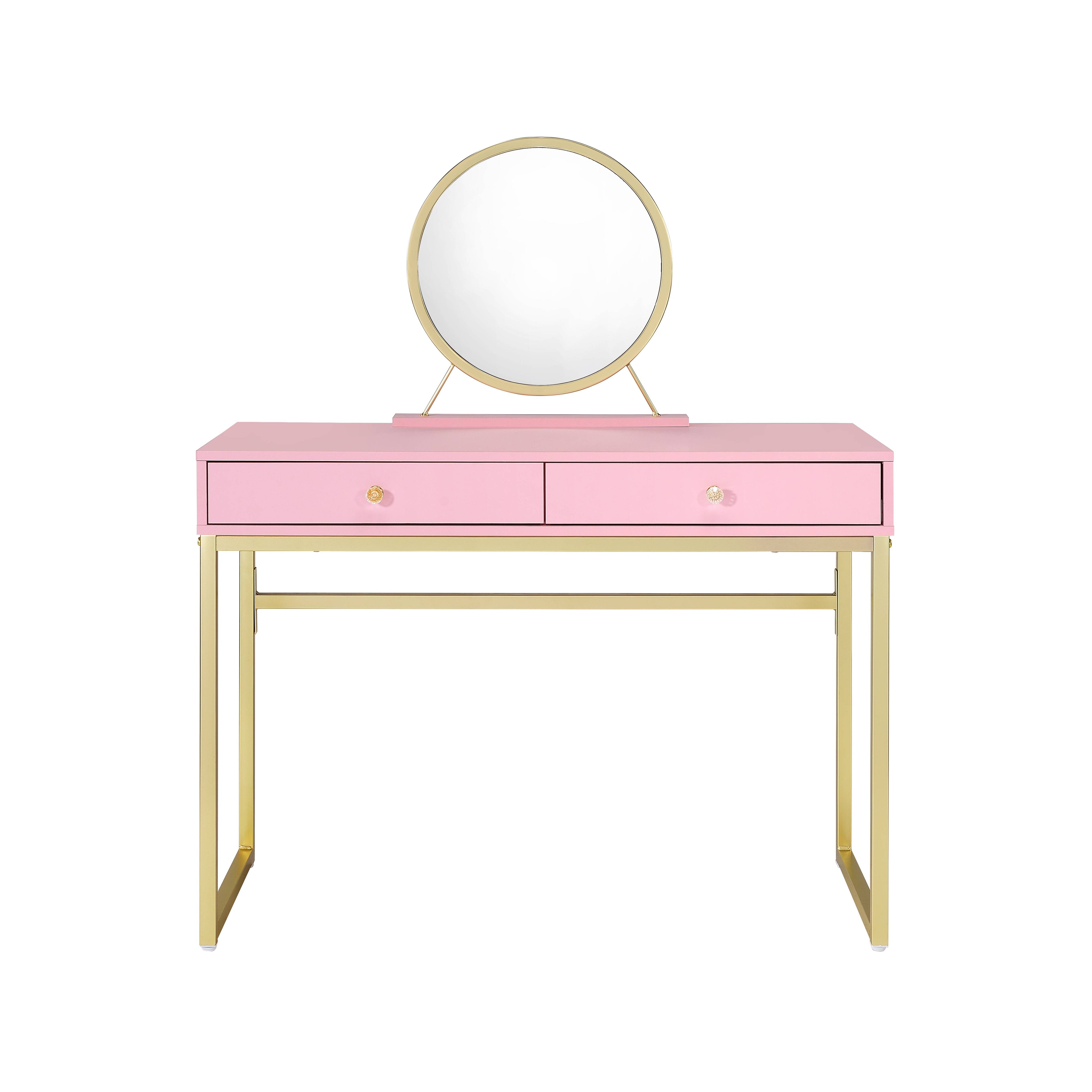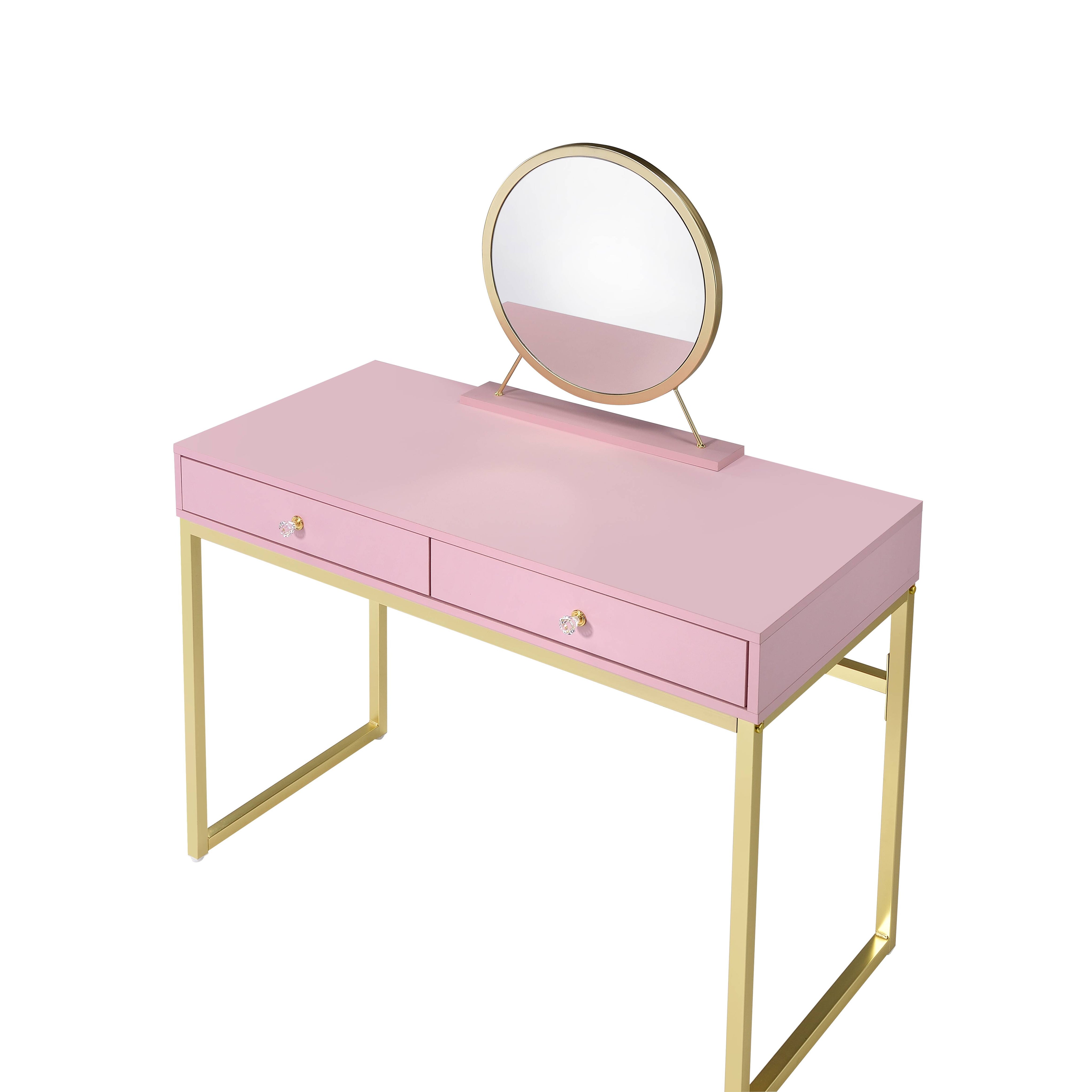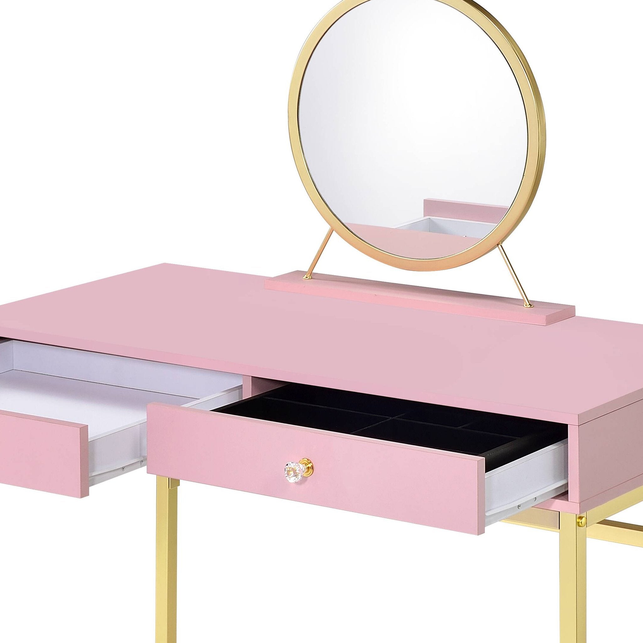 Elevate your dressing area with this elegant pink and gold vanity desk that blends glamour with practical storage. Designed for everyday use or special occasions, its metal frame, crystal accents, and included mirror and jewelry tray create a polished, cohesive look while providing thoughtful organization for cosmetics, accessories, and grooming tools.