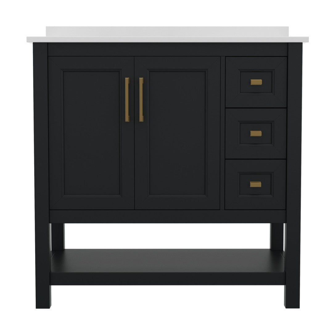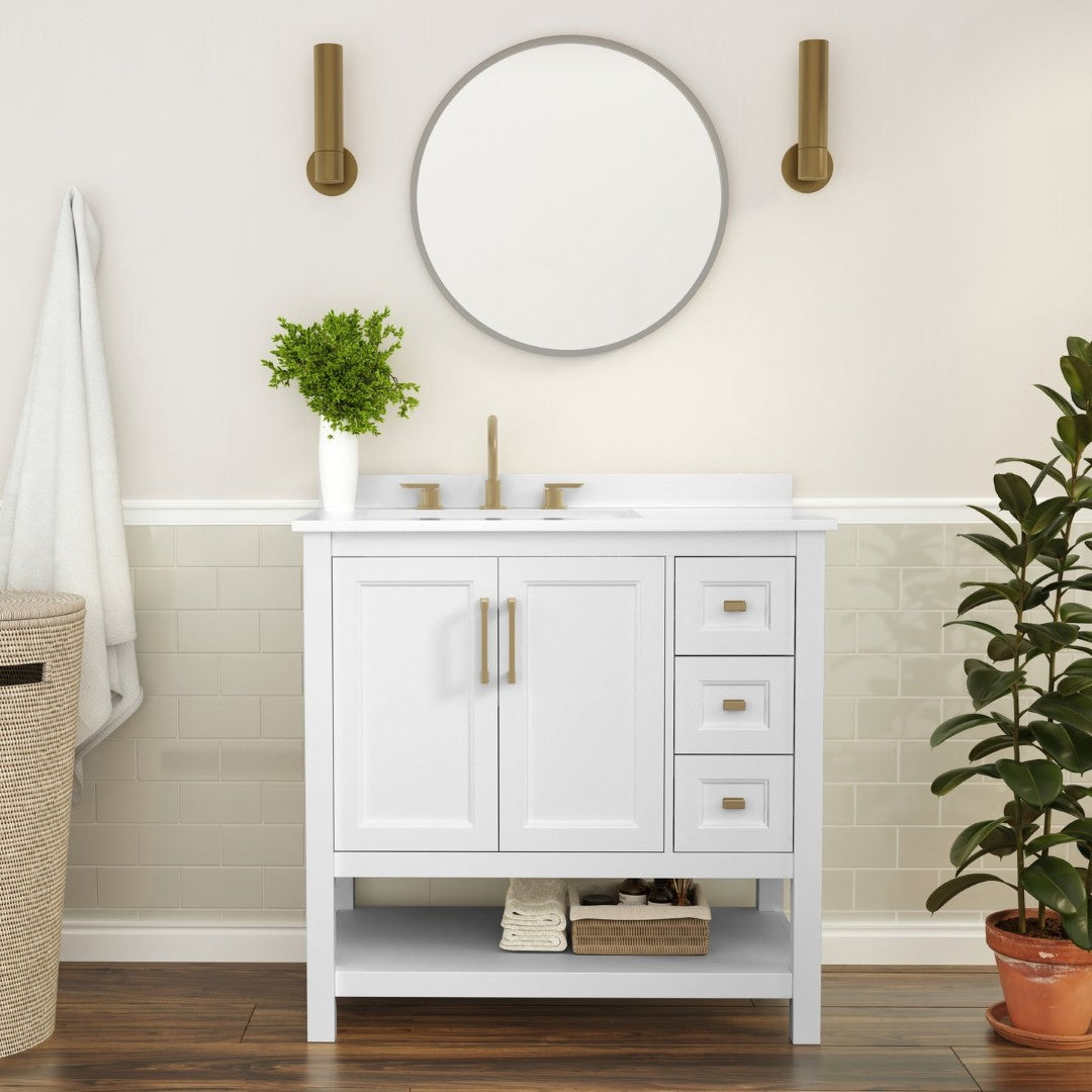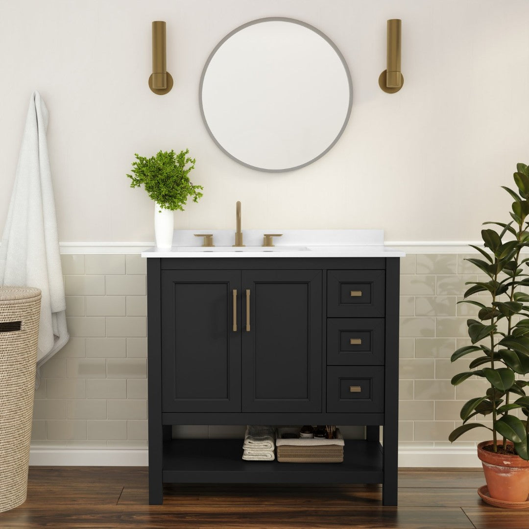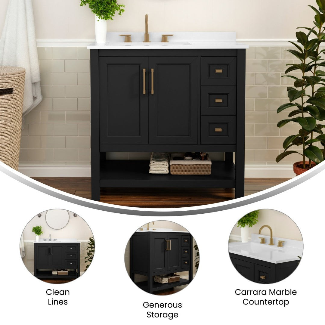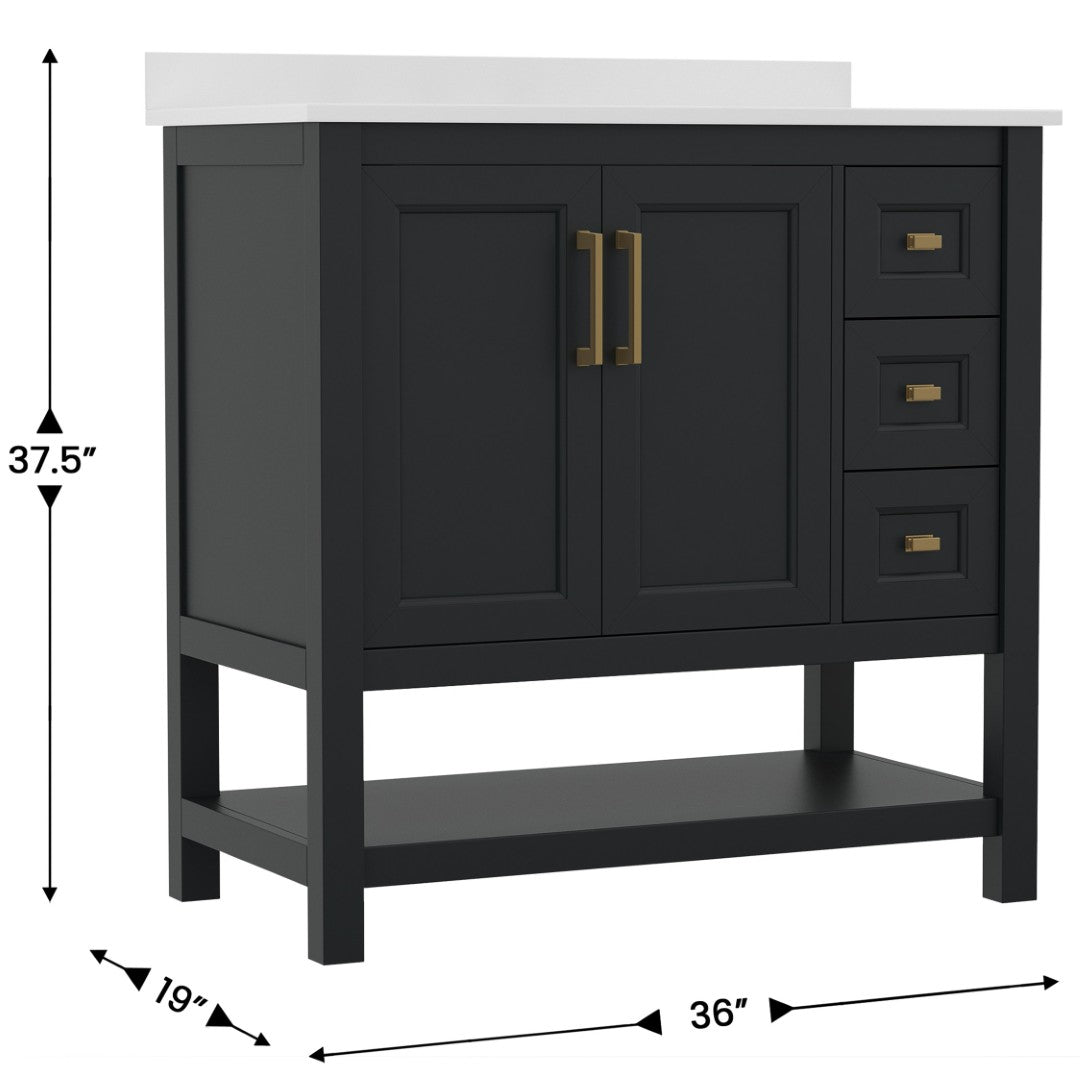 Give your bathroom an instant, high-impact refresh without a full remodel. This 36-inch vanity combines modern styling and thoughtful storage in a single, ready-to-install package: a Carrara marble–finish countertop with an undermount ceramic sink, a durable engineered wood cabinet with soft-close doors and smooth-glide drawers, plus an open shelf for linens or display. Designed for everyday use in humid environments, it balances form and function—luxurious details like black and gold hardware complement practical touches such as adjustable shelving, a choice to install the backsplash, and a sturdy construction that supports heavy loads.