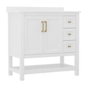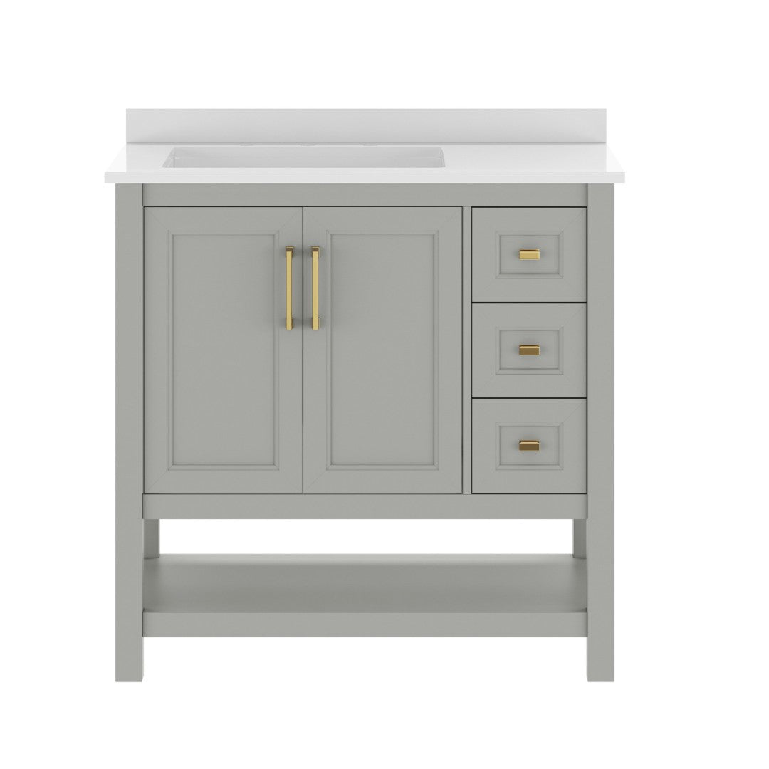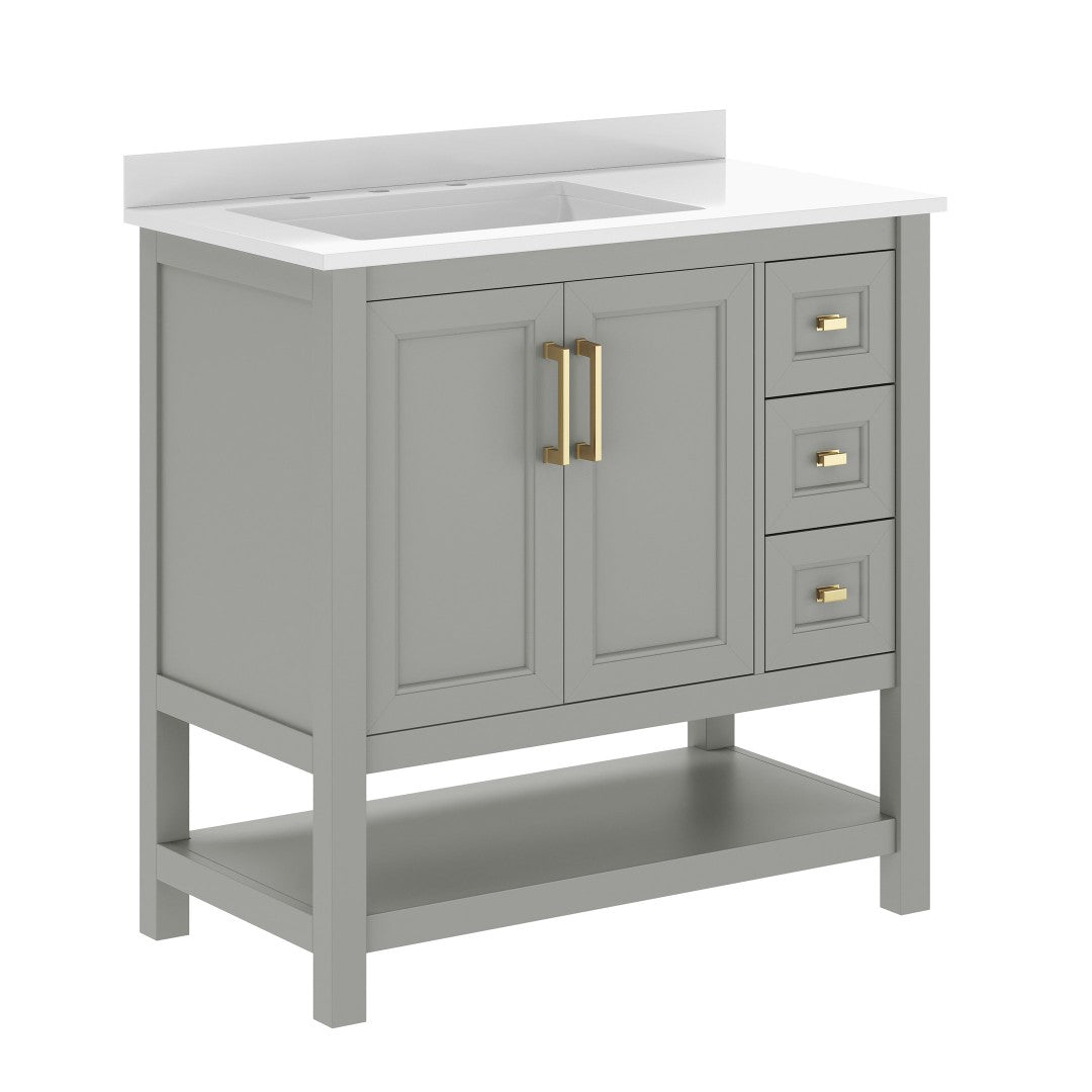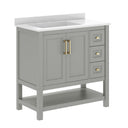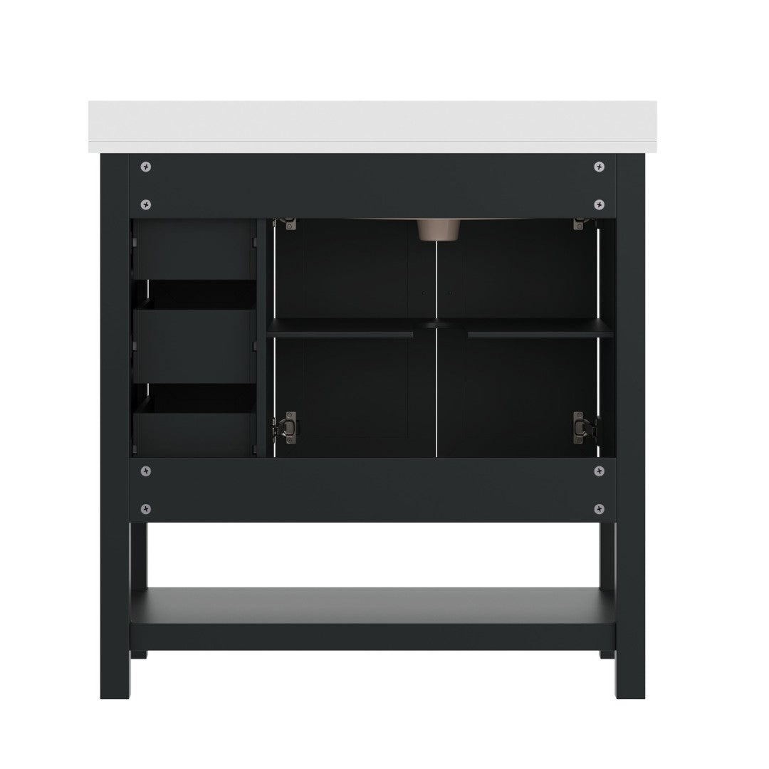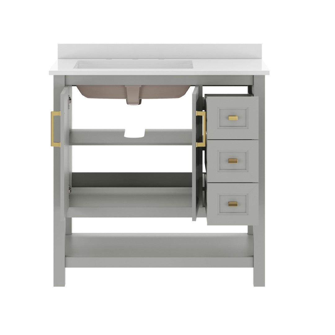 Give your bathroom an instant, high-impact refresh without a full remodel. This 36-inch vanity combines modern styling and thoughtful storage in a single, ready-to-install package: a Carrara marble–finish countertop with an undermount ceramic sink, a durable engineered wood cabinet with soft-close doors and smooth-glide drawers, plus an open shelf for linens or display. Designed for everyday use in humid environments, it balances form and function—luxurious details like black and gold hardware complement practical touches such as adjustable shelving, a choice to install the backsplash, and a sturdy construction that supports heavy loads.