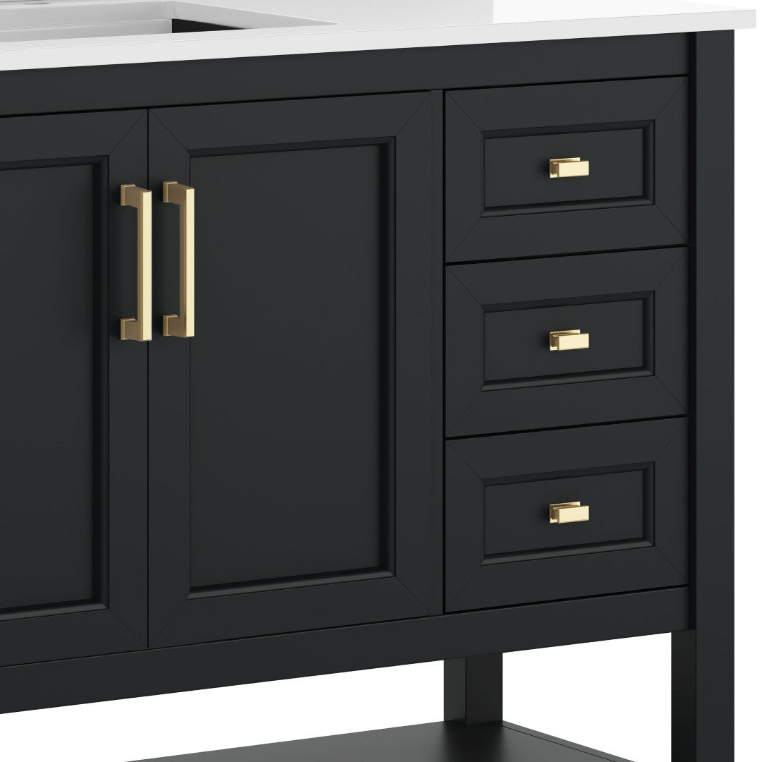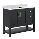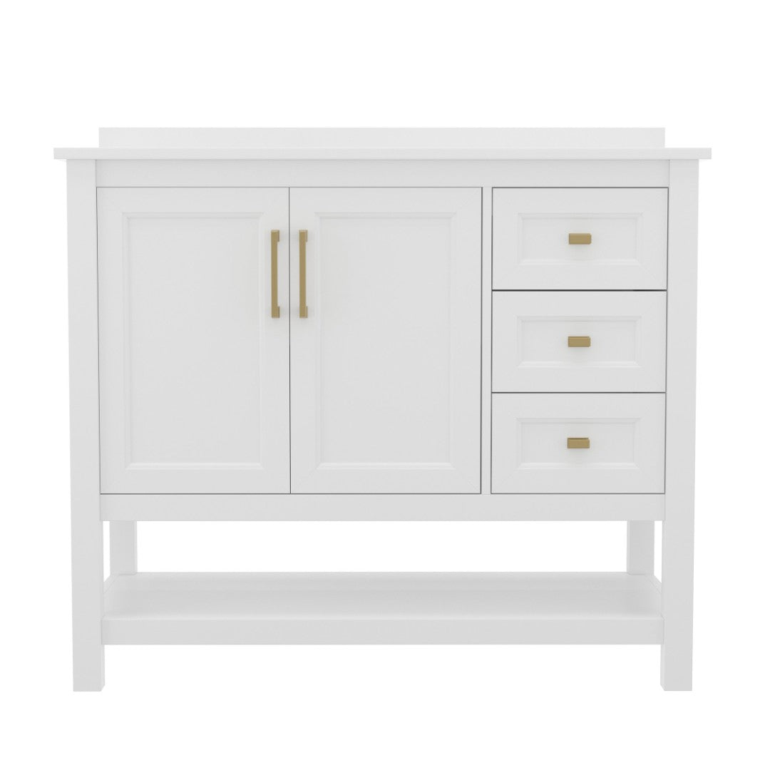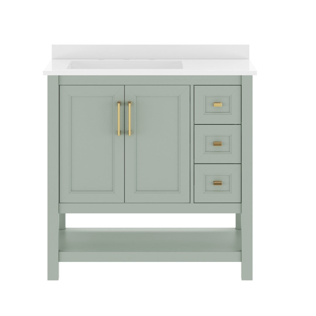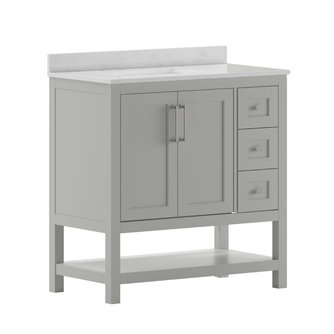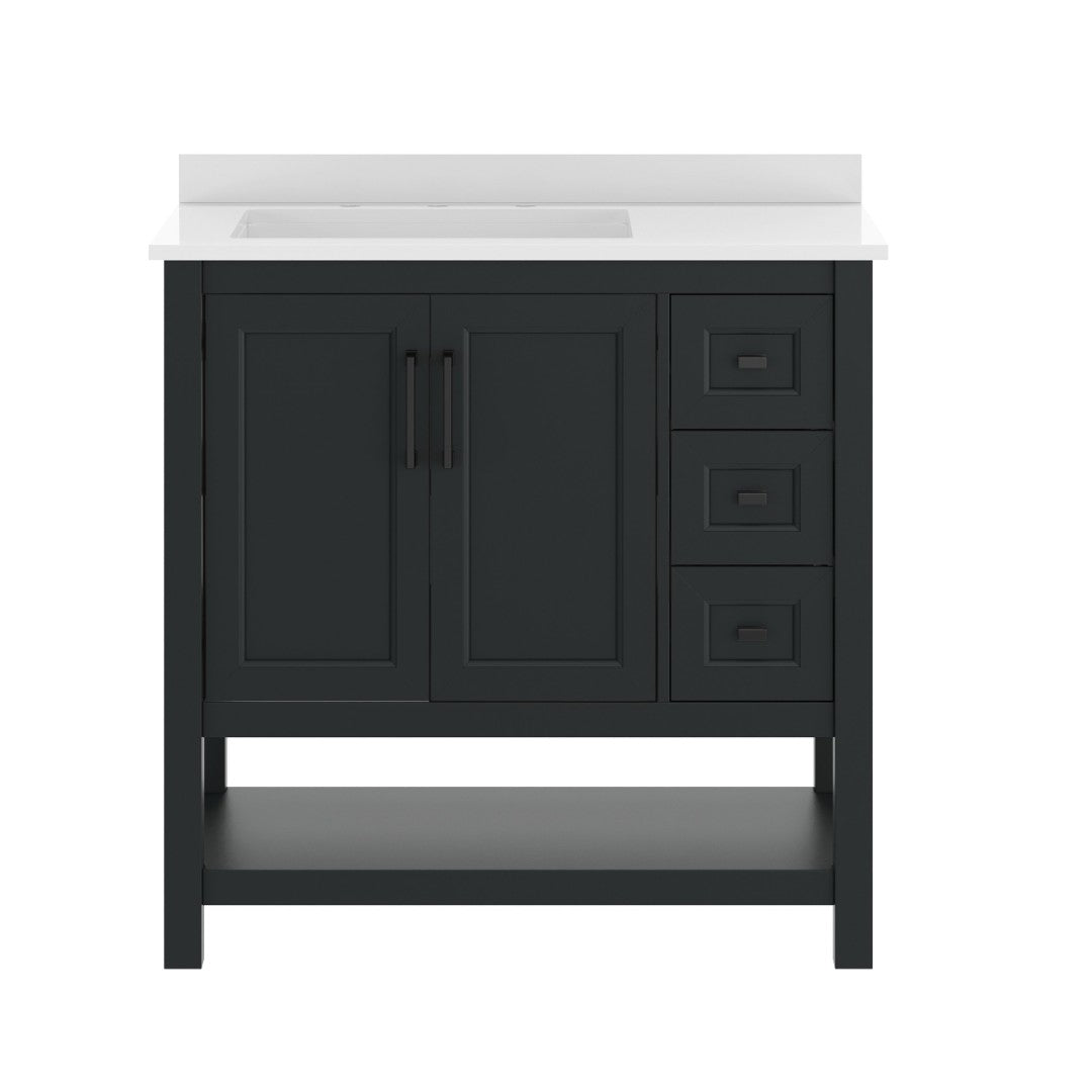 Give your bathroom an instant, high-impact refresh without a full remodel. This 36-inch vanity combines modern styling and thoughtful storage in a single, ready-to-install package: a Carrara marble–finish countertop with an undermount ceramic sink, a durable engineered wood cabinet with soft-close doors and smooth-glide drawers, plus an open shelf for linens or display. Designed for everyday use in humid environments, it balances form and function—luxurious details like black and gold hardware complement practical touches such as adjustable shelving, a choice to install the backsplash, and a sturdy construction that supports heavy loads.