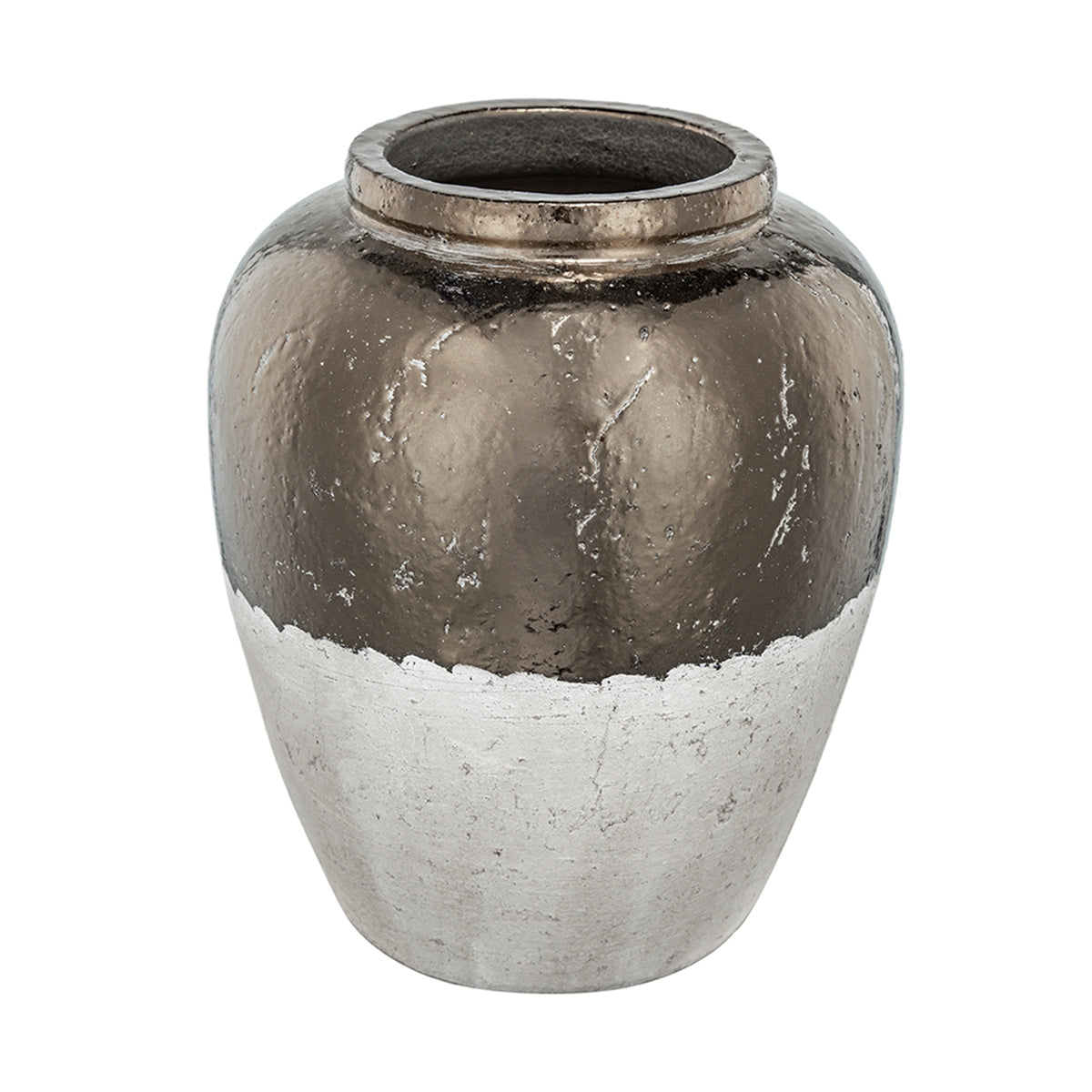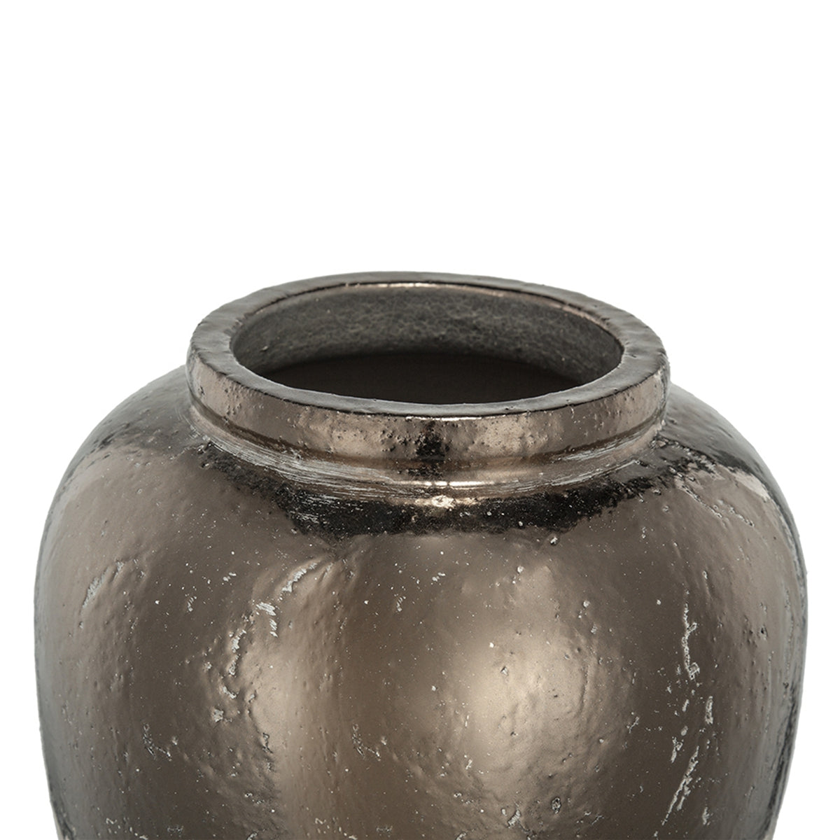- Featuring a round silhouette, a wide opening, and a unique blend of distressed sienna brown tones and a metallic sheen, this decorative vase offers timeless style and function to your home decor.