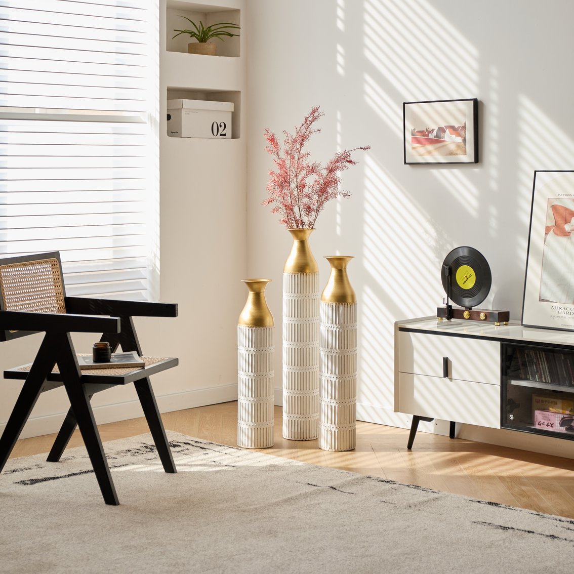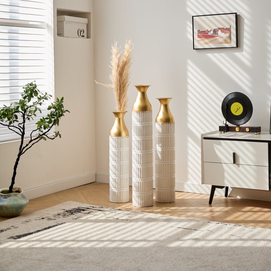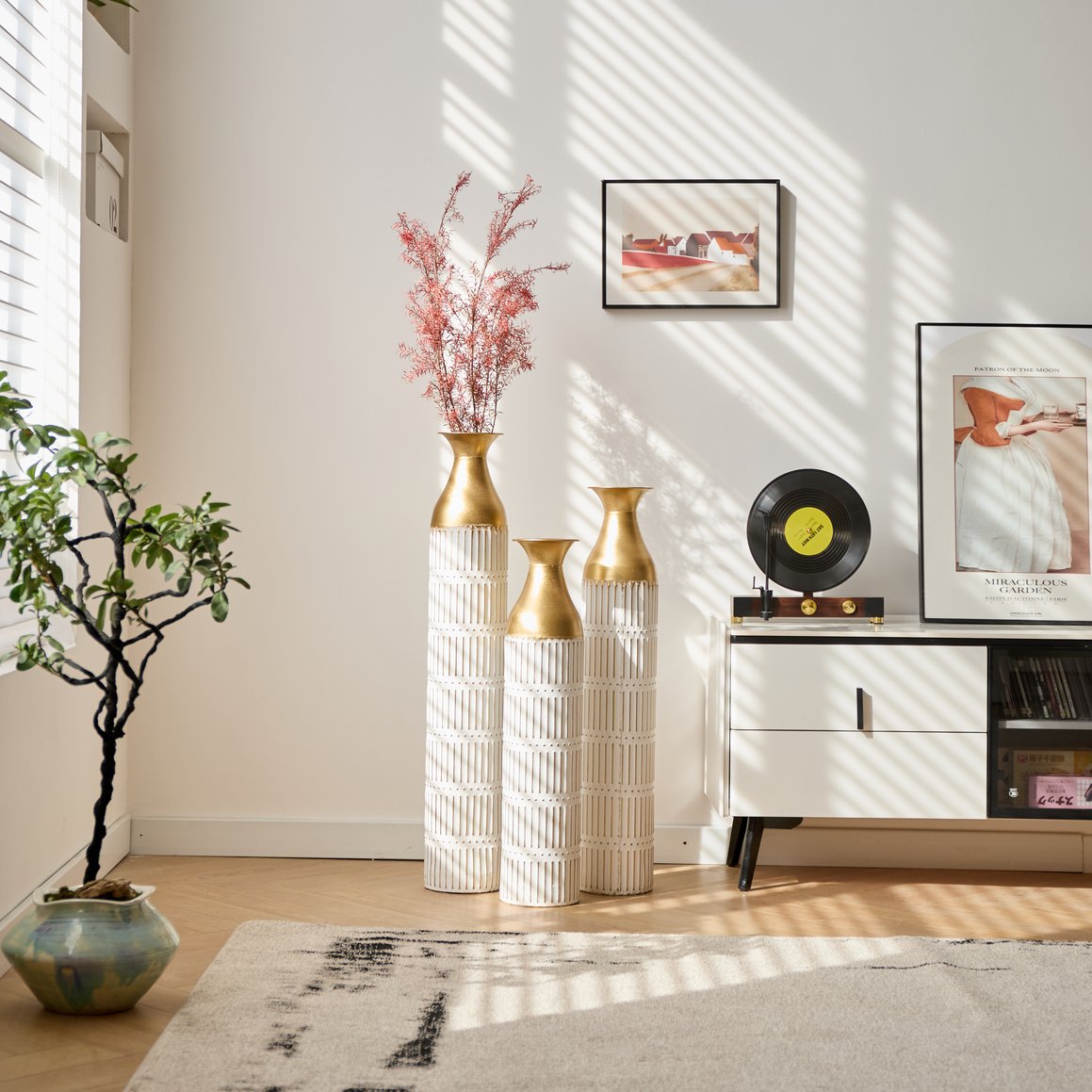 - Decorative white vases: these tall metal vases feature a blend of polished and hammered gold finishes