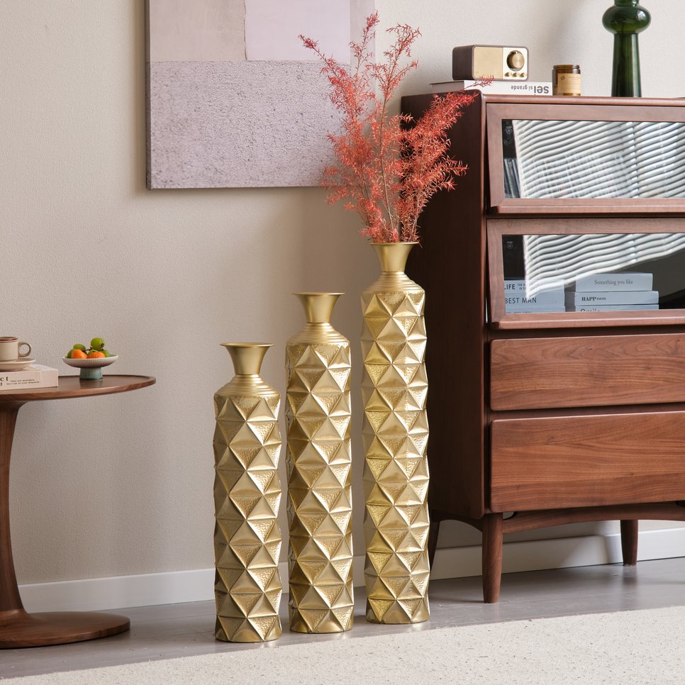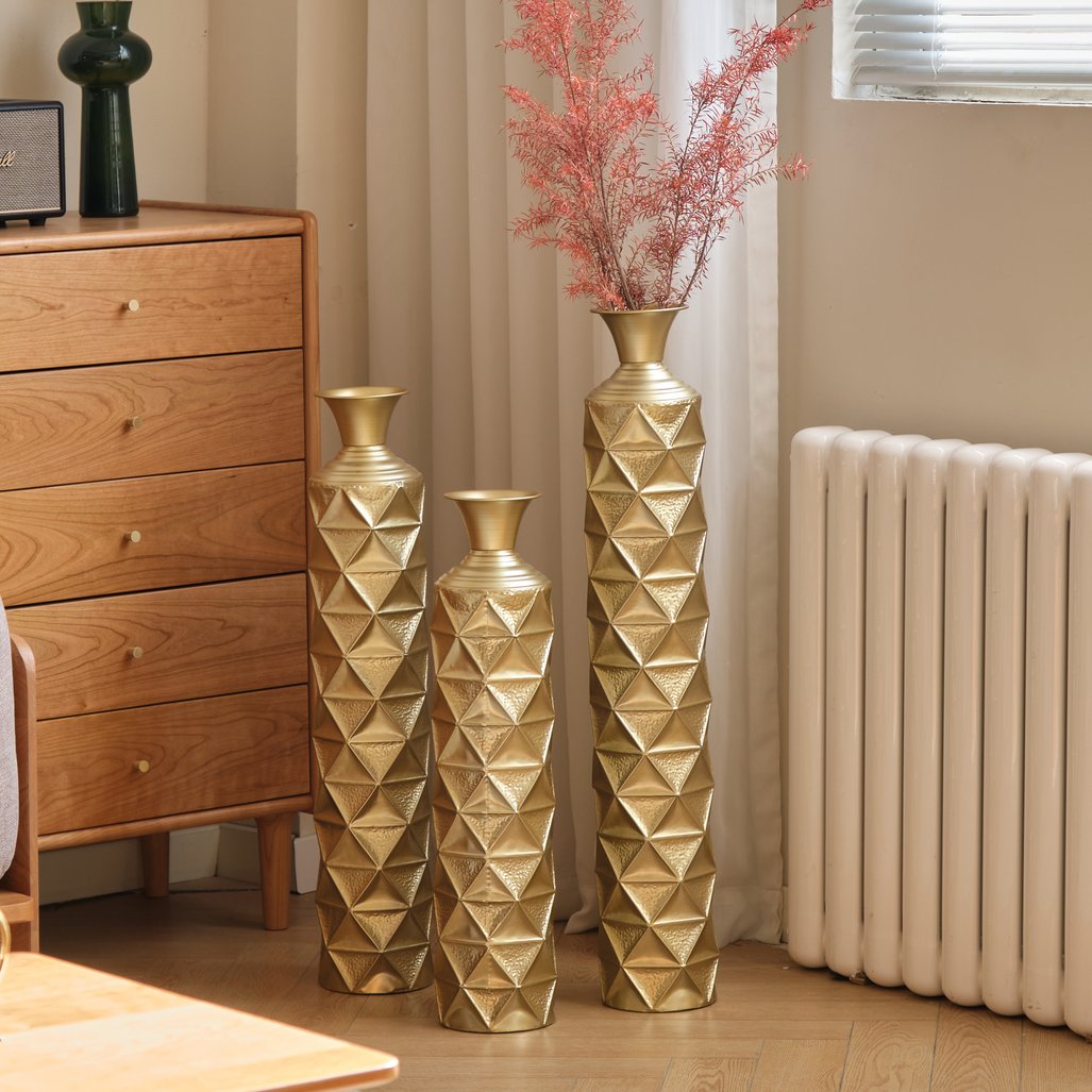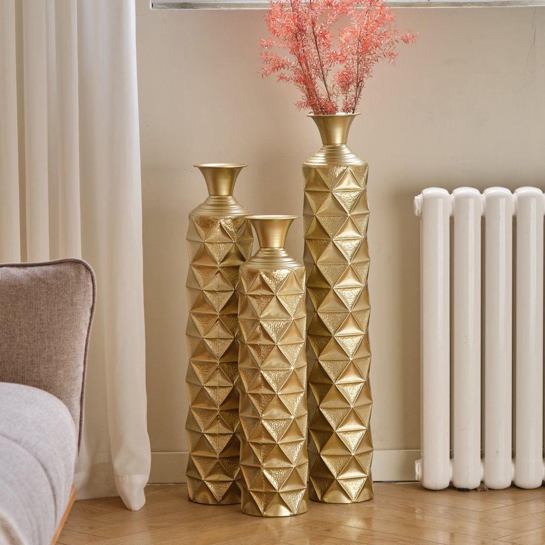 Elevate your interior with this striking set of three antique-gold metal vases, designed to combine modern geometric style with durable metal construction. Each piece features a sculptural cylindrical silhouette, embossed 3D triangle pattern, and a mixed polished/hammered finish that reflects light and adds depth — perfect as standalone statement pieces or grouped together on a console, mantle, or floor.