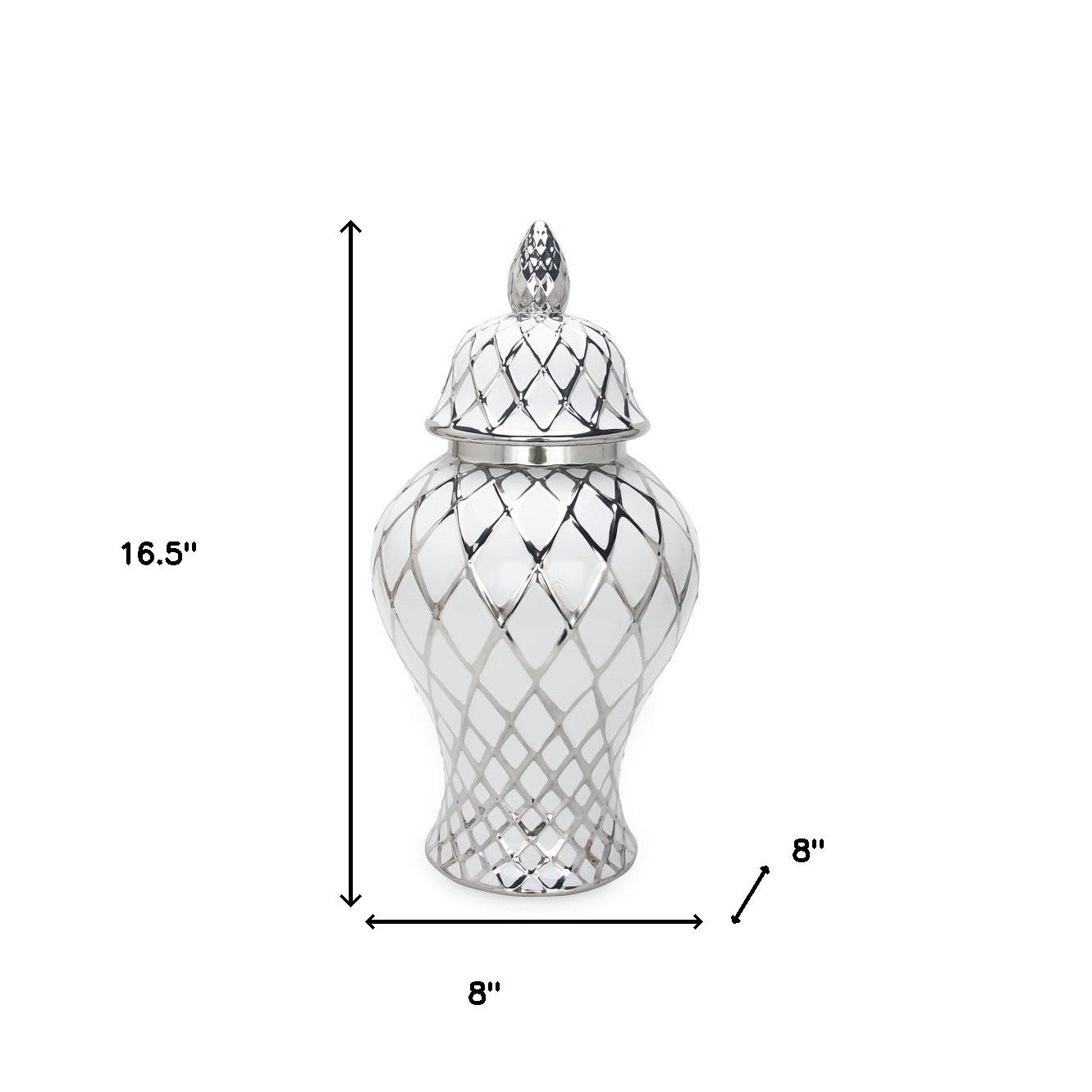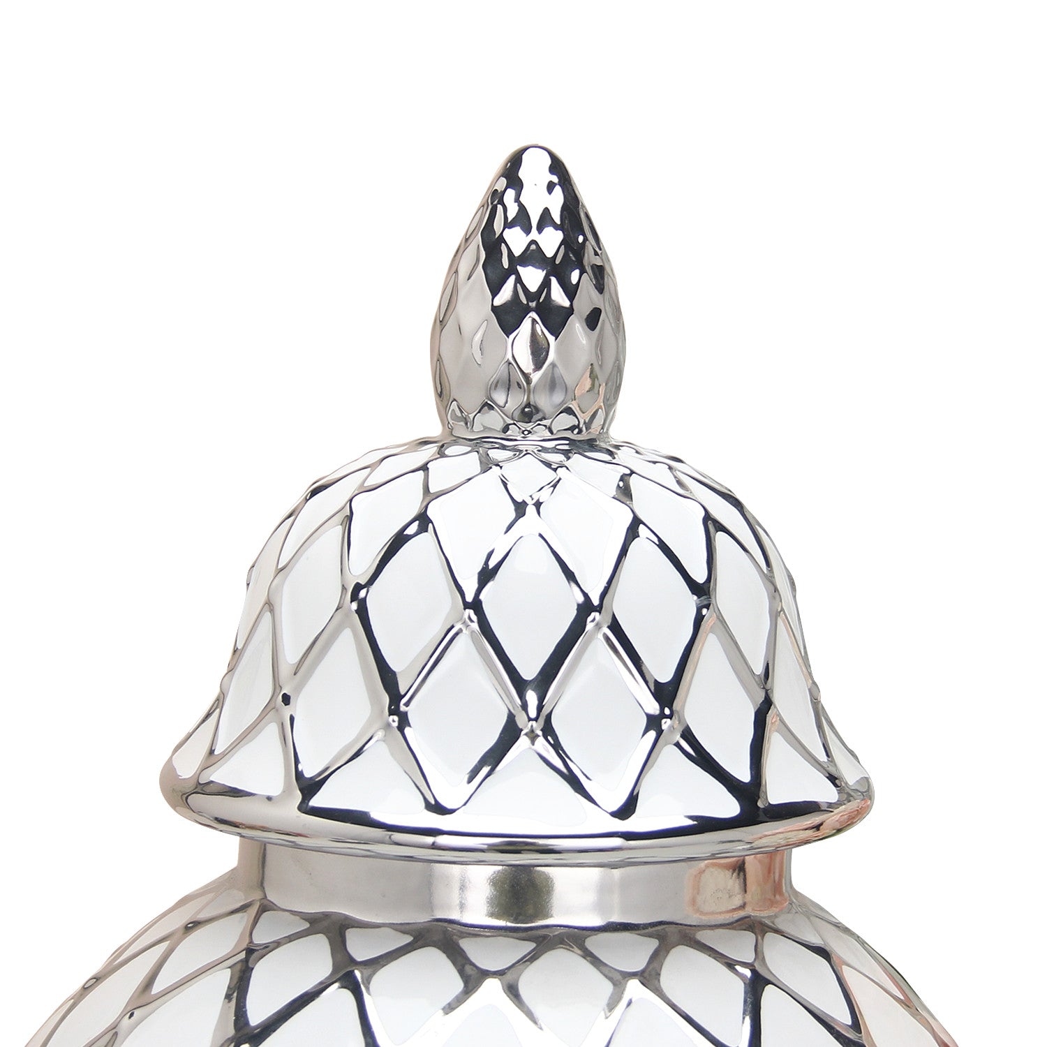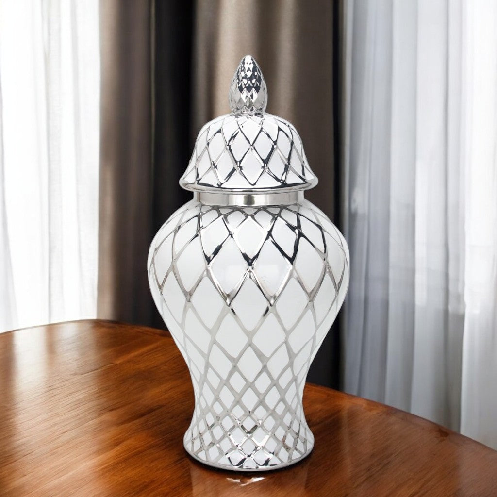 - Contemporary ceramic jar features an ornate geometric pattern.