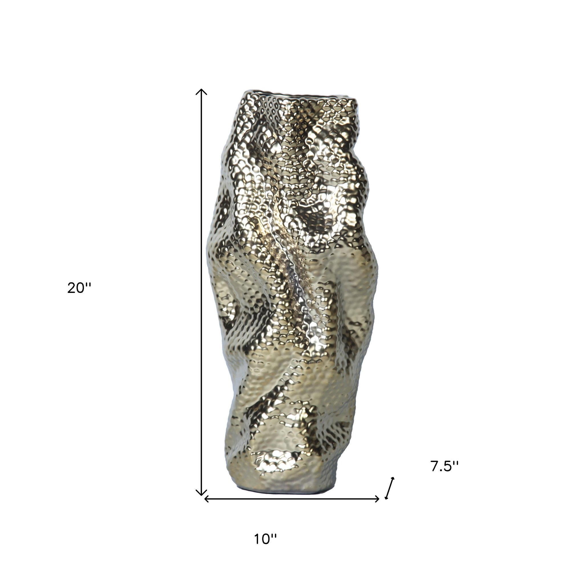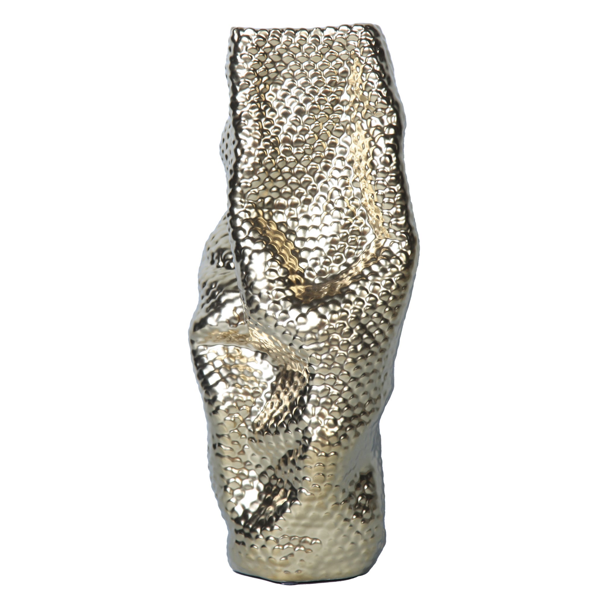 - Ceramic modern and chic figural, abstract, and funky vase in a textured hammered gold finish.
