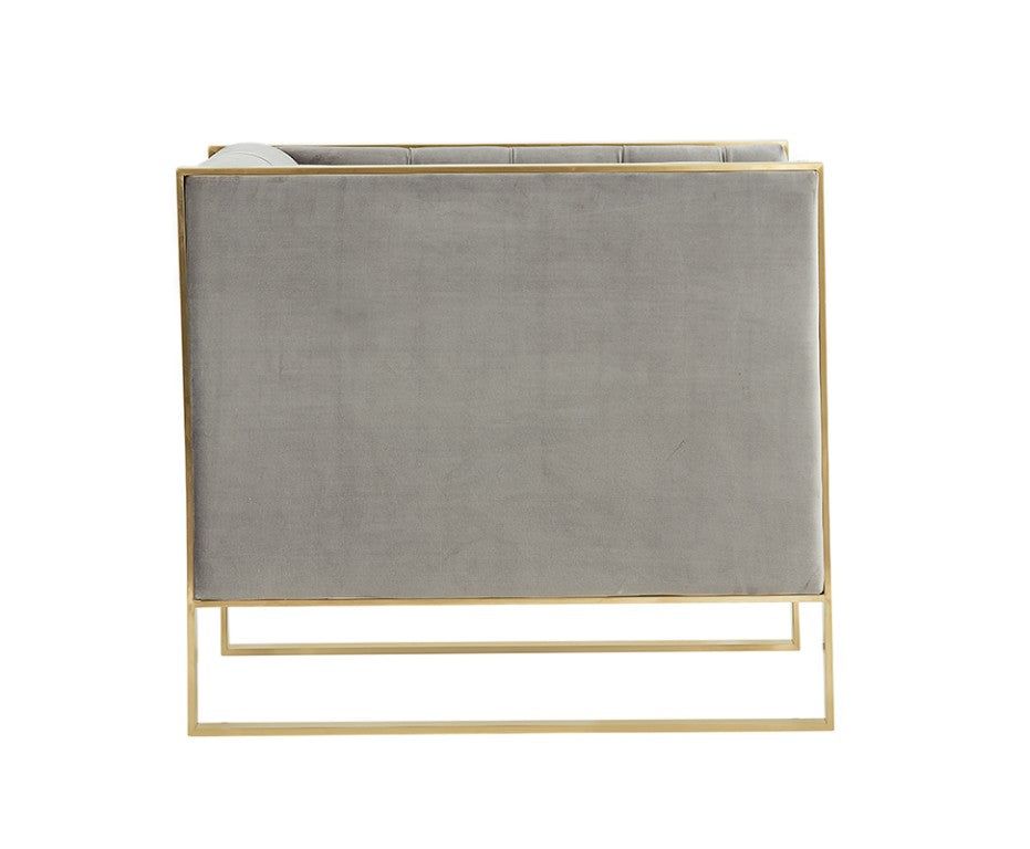 Elevate your living space with a refined accent chair that blends modern lines and mid-century comfort. Upholstered in soft grey velvet with a plush, tufted backrest and dense padding, this chair creates a cozy yet sophisticated focal point. The angular silhouette and aligned arm-and-back design invite relaxation, while the gold stainless steel frame adds a sleek, contemporary contrast that enhances any room — from lounges and bedrooms to office nooks. No assembly required; ready to use right out of the box.